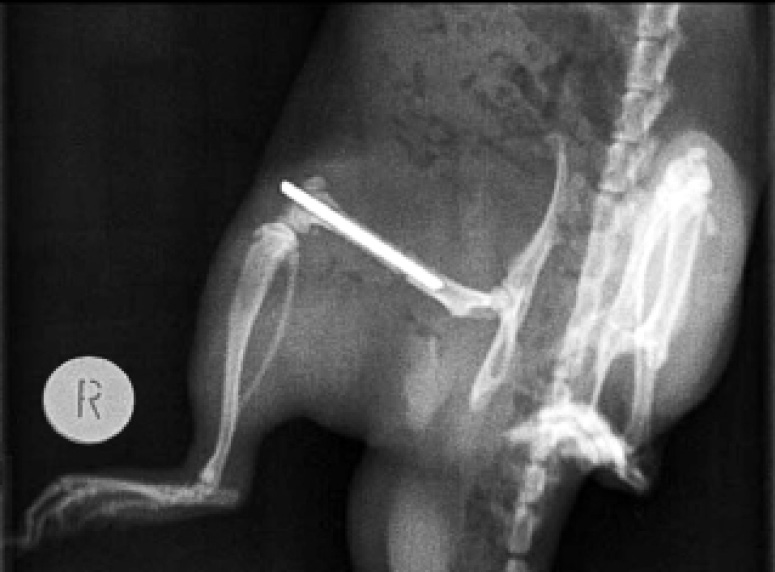 Рис. 2. Рентгенограмма правой задней конечности крысы (30 суток после операции). Металлоостеосинтез (спицей Киршнера) диафизарного перелома бедренной кости. Замедленная консолидация перелома