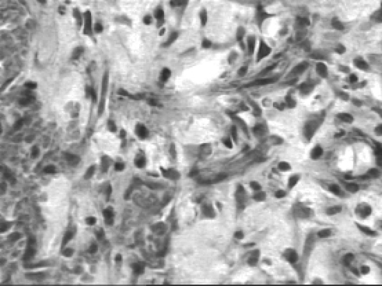 Рис. 4. Микропрепарат мягких тканей в области раны бедра крысы через 10 суток после РМП. Окраска гематоксилином и эозином, ув. ×250