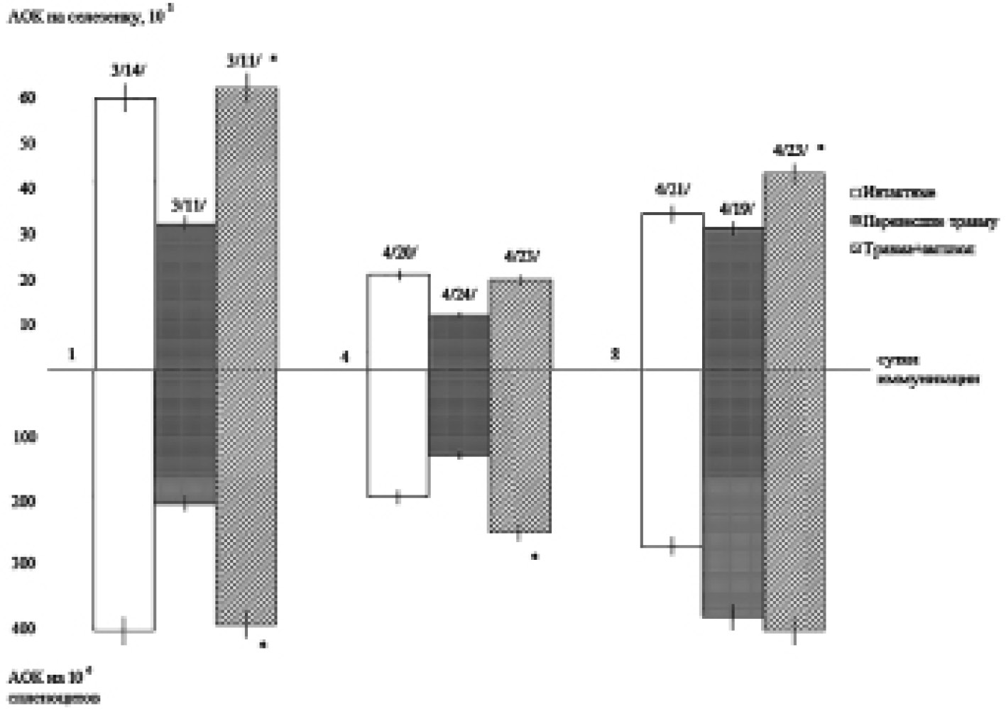 Рис. 1. Динамика гуморального иммунного ответа на эритроциты барана мышей, перенесших тяжелую политравму и получивших амтизол