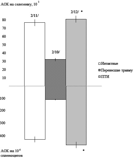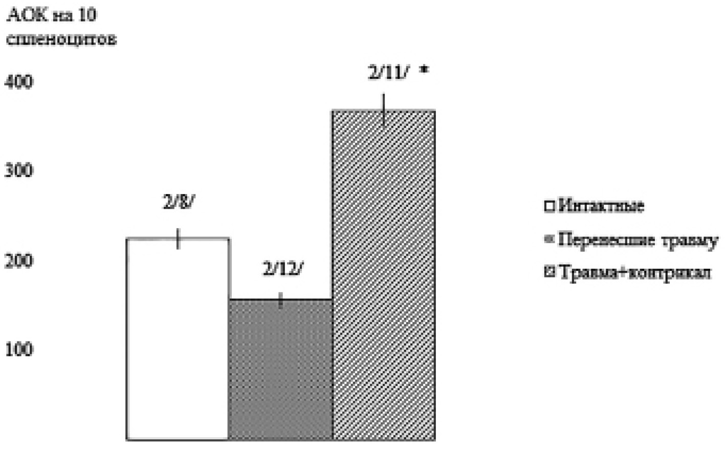 Введение. Известно, что тяжелое состояние пострадавших может быть обусловлено не только шоком, но и осложнениями постшокового периода. Как правило, это легочные осложнения, обусловленные посттравматическим иммунодефицитом, индуцированным патогенетическими факторами травмы: 1) неадекватной (прежде всего болевой) афферентацией из поврежденных тканей; 2) кровоплазмопотерей; 3) токсемией; 4) гипоксией. В селезенке животных, выживших после тяжелой политравмы и иммунизированных Т-зависимым антигеном, накапливается достоверно меньше антителообразующих клеток (АОК) по сравнению с их числом в селезенке интактных животных. В этом контексте представляется значимым оценить возможность профилактики посттравматического иммунодефицита уже на этапе оказания первой медицинской помощи, в частности проанализировать иммунопротективное действие антигипоксантов (амтизол и производное 1, 2, 4-триазино-5, 6 индола (ПТИ)), ограничивающего токсемию препарата контрикала и катионоакцепторного препарата диметилсульфоксида (димексида).