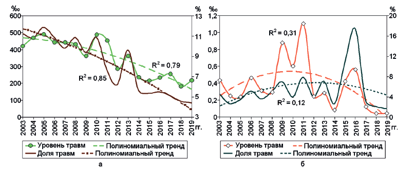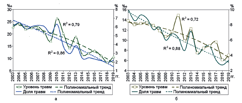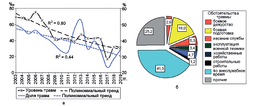 Результаты и их обсуждение. Установлено, что среднегодовой уровень травматизма у офицеров ВС России в 2003–2019 гг. составил 17,59±1,37‰, их среднегодовая доля в структуре первичной заболеваемости офицеров по всем классам МКБ-10 – 4,2±0,4%. Вклад травм офицеров в травматизм всех военнослужащих ВС России равнялся 32%. Полиномиальные тренды уровня и доли травматизма при высоких коэффициентах детерминации (R2=0,79 и R2=0,86) показывают уменьшение данных (рис. 1 а).