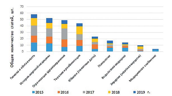 Рис. 2. Количество публикаций по тематическим направлениям в журнале «Морская медицина» за период с 2015 по 2019 гг.