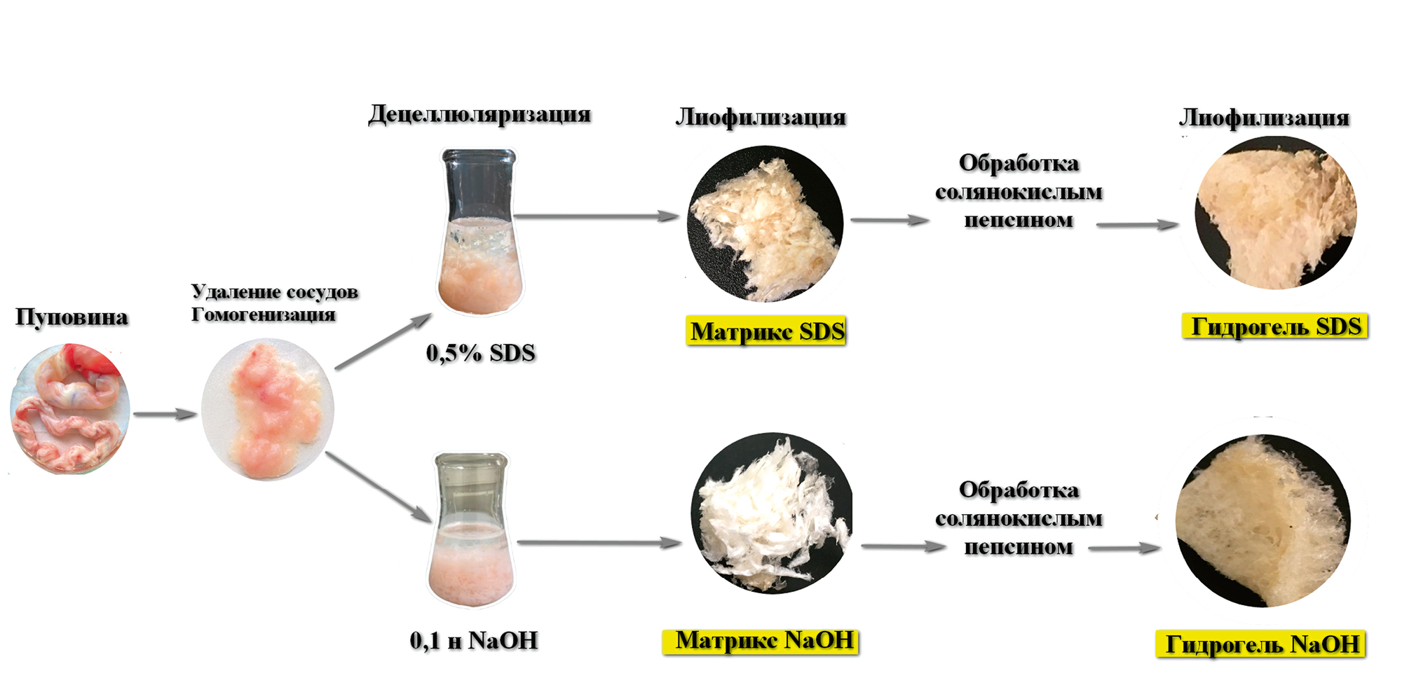 Для приготовления гидрогелей матриксы подвергали ферментативной обработке пепсином в кислой среде в соотношении 10 мг матрикса на 1 мл раствора пепсина. Один миллиграмм пепсина (P/1120/46) фирмы «Thermo Fisher Scientific» (Германия) растворяли в 1 мл 0,01 Н HCl, pH 2,0. Ферментацию проводили в течение 72 ч при комнатной температуре со скоростью 180 об/мин. Действие пепсина останавливали, доводя кислотность раствора до pH 7,4 с помощью 0,1 Н NaOH. Продукты лиофилизировали. Таким образом изготовили два вида гидрогелей: «Гидрогель SDS» и «Гидрогель NaOH» (рис. 1).