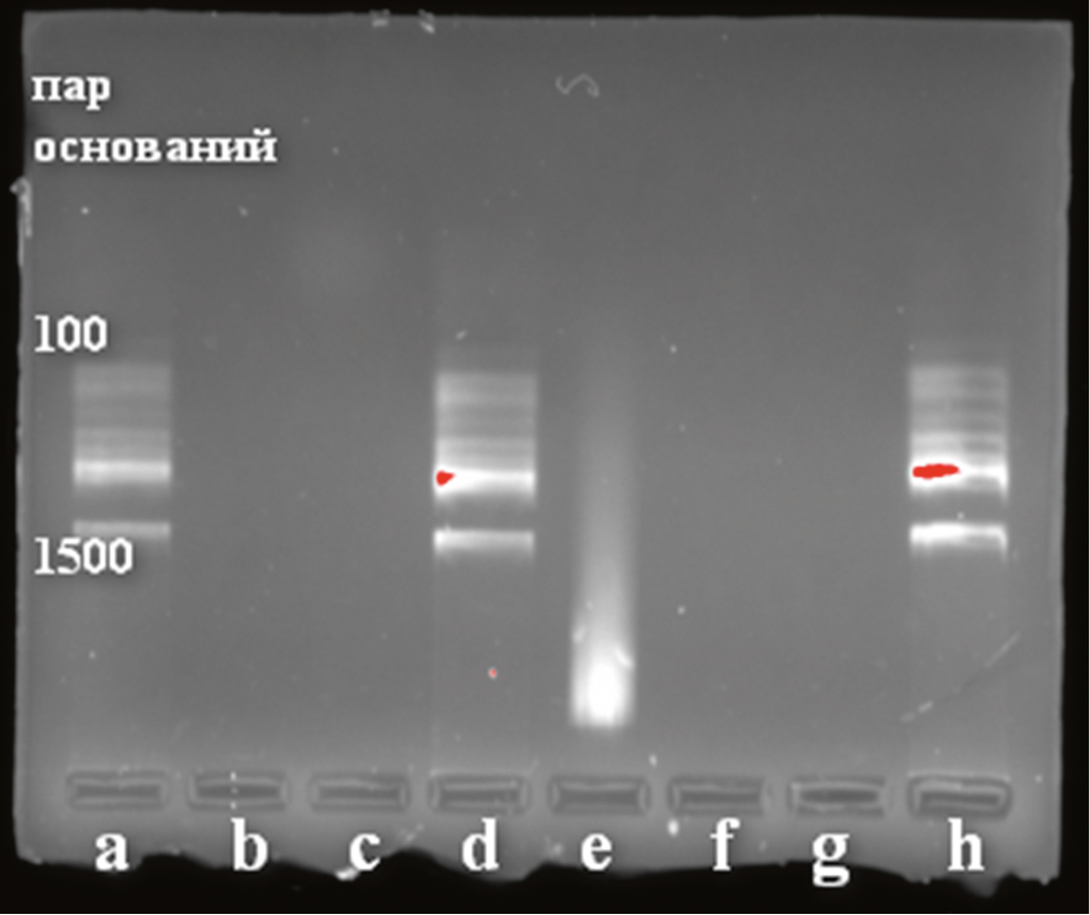 Рис. 2. Электрофорез в геле агарозы: a, d, h — ДНК-маркер молекулярного веса; b — матрикс SDS; c — матрикс NaOH; e — нативная пуповина; f — гидрогель SDS; g — гидрогель NaOH