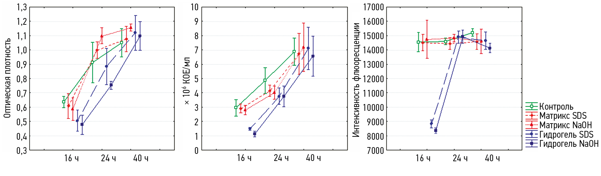 Для оценки влияния бесклеточных матриксов и гидрогелей из пуповины человека на метаболическую активность микроорганизмов был использован резазурин. В присутствии активно метаболизирующих живых объектов происходит восстановление синего резазурина в розовый и флуоресцирующий резоруфин. В процессе анализа использовали бактерии в стационарной фазе роста. Для этого суспензию микроорганизмов после 16–18 ч культивирования охлаждали до 4 ℃. Kультивирование проводили в стерильных стеклянных пробирках в аналогичных соотношениях LB, гидратированного образца и бактериальной суспензии микроорганизмов стационарной фазы роста (n = 8), как описано выше. Спустя 16, 24 и 40 ч от инокуляции в лунки 96-луночного плоскодонного планшета производства «Росмедбио» (Россия) вносили по 300 мкл из каждой пробирки и добавляли по 20 мкл раствора резазурина производства «Биокомпас-С» (Россия) на фосфатном буфере в концентрации 600 мкМ. Через 30 мин инкубации при 37 ℃ со скоростью встряхивания 300 об/мин на планшетном термошейкере «PST-60» фирмы «Biosan» (Латвия) измеряли интенсивность флуоресценции на многофункциональном планшетном анализаторе «Victor X5» фирмы «Perkin Elme» (США) при длине волны 595 нм с возбуждением на 560 нм.