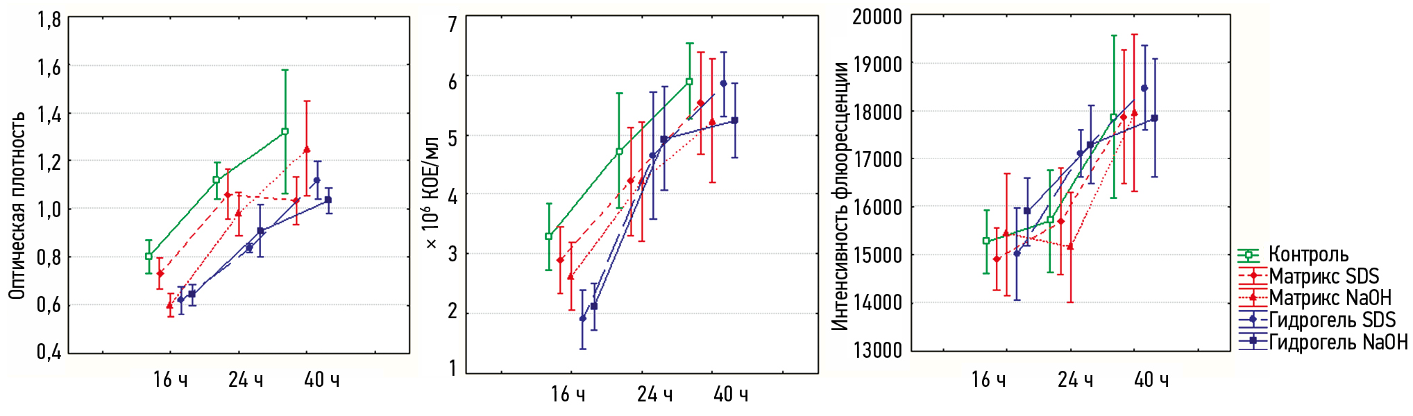 Рис. 5. Динамика культивирования Escherichia coli КS-507 в присутствие бесклеточных матриксов и гидрогелей из пуповины человека и в контроле (M ± SD)