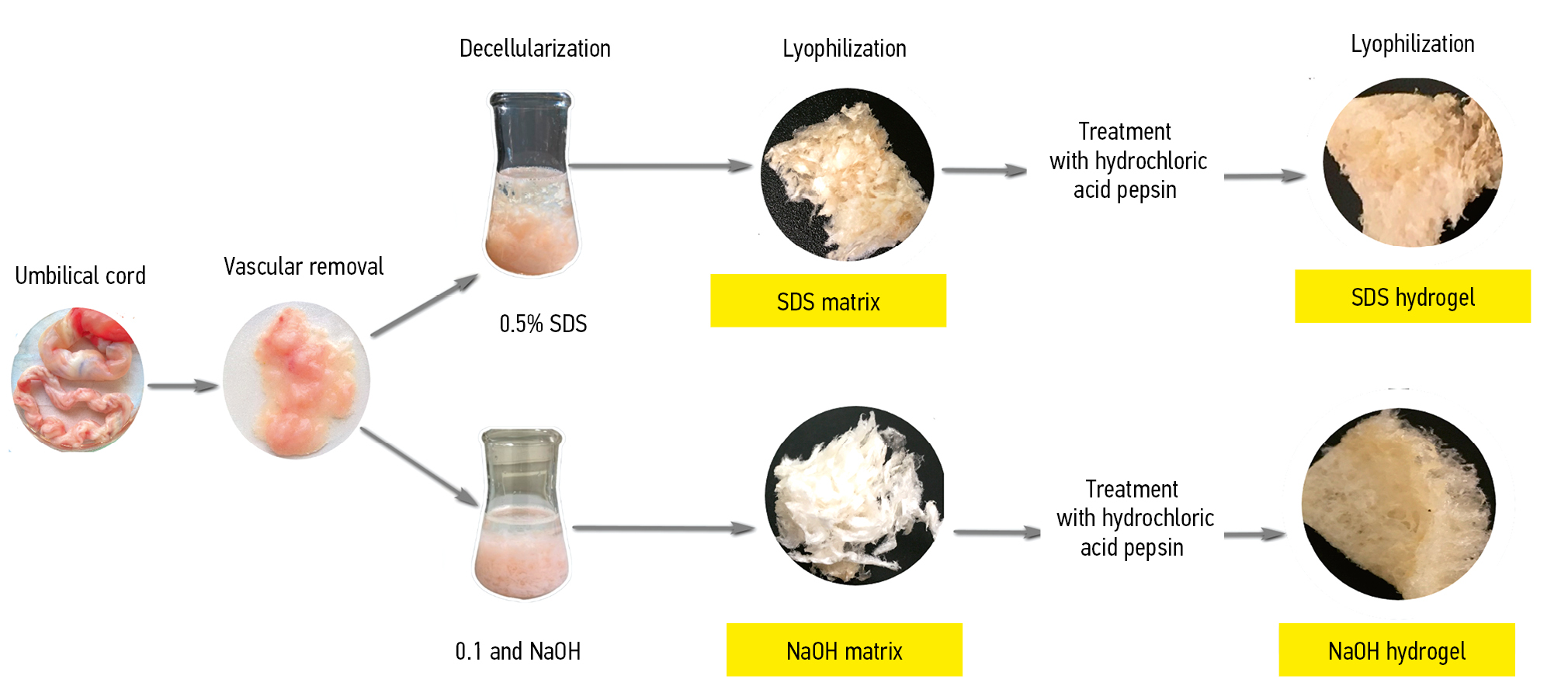 Fig. 1. Manufacturing scheme and appearance of human umbilical cord-derived matrices and hydrogels