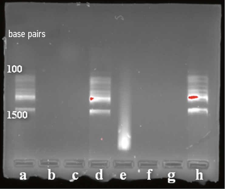 Fig. 2. Electrophoresis in agarose gel: a, d, h — DNA molecular weight marker; b — SDS matrix; c — NaOH matrix; e — native umbilical cord; f — SDS hydrogel; g — NaOH hydrogel
