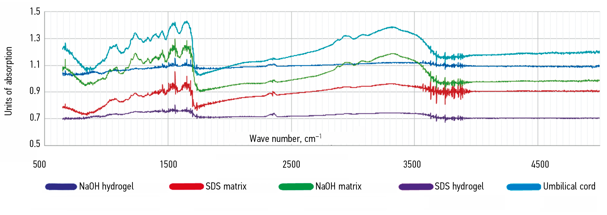 Lyophilizates of decellularized matrices and hydrogels and native umbilical cord biomaterials were examined by Fourier transform infrared spectroscopy. The products were predominantly collagen and contained glycosaminoglycans (Fig. 3).