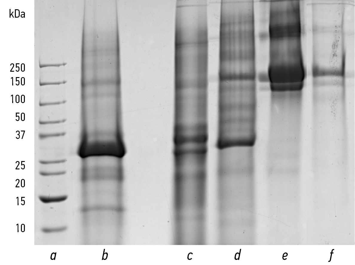 Fig. 4. Electrophoresis of samples in polyacrylamide gel: a — protein molecular weight marker; b — native umbilical cord; c — SDS matrix; d — Matrix NaOH; e — SDS hydrogel; f — NaOH hydrogel