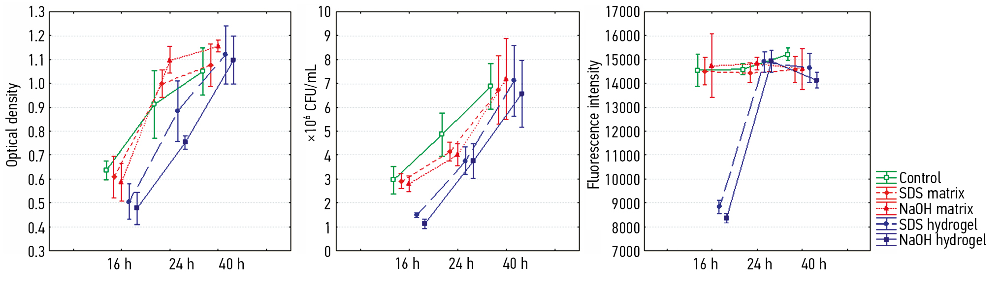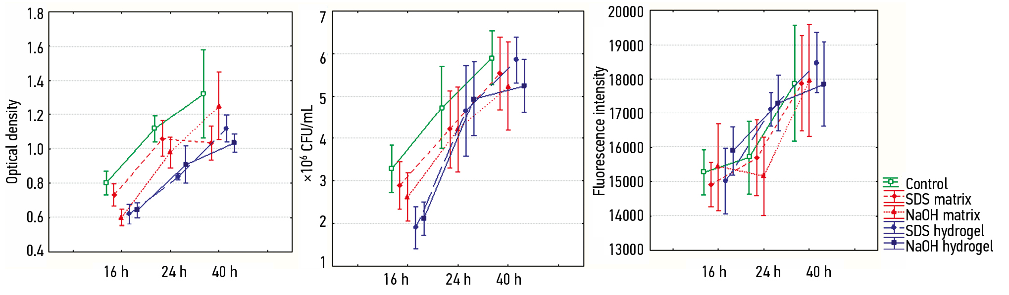 Fig. 5. Dynamics of the cultivation of Escherichia coli KS-507 in the presence of human umbilical cord-derived acellular matrices and hydrogels and in control (M ± SD)