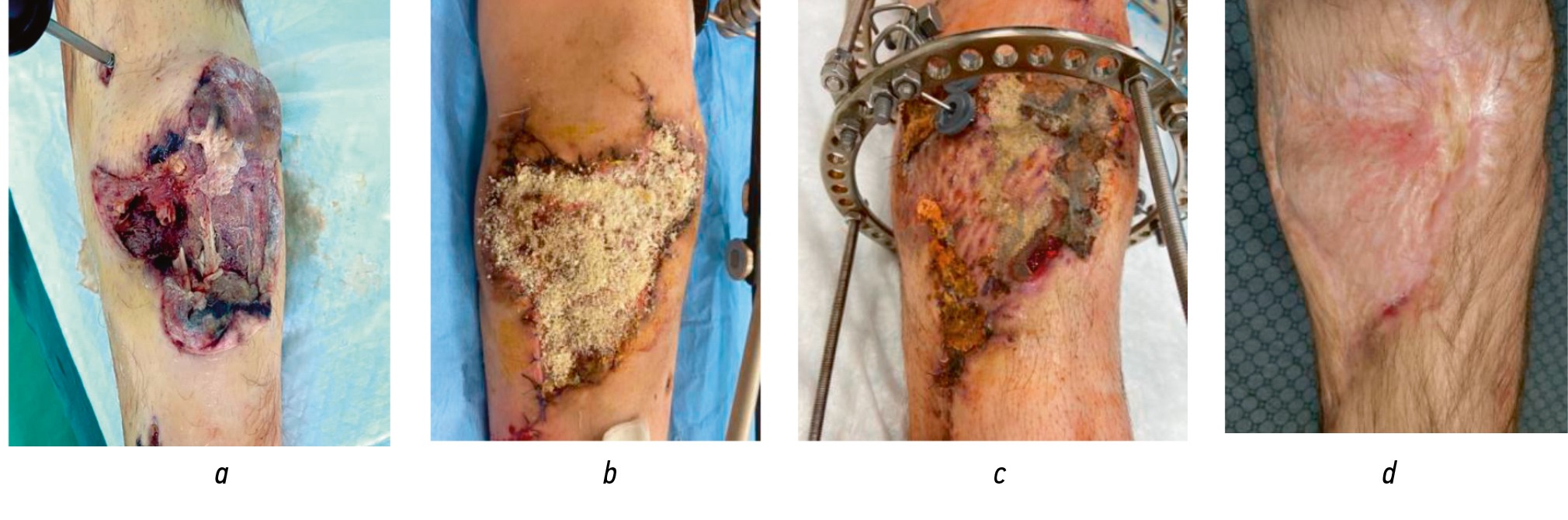 The patient received surgical treatment with excision of nonviable soft tissues. On day 25 after the wound was sustained, the patient underwent skin grafting of the anteromedial defect of the lower third of the right tibia with a non-free sural flap (Fig. 8, b). On day 5 after the surgery, pathological greenish discharge with an unpleasant odor from the wound margins, increasing cyanosis, and dense consistency of the flap were noted. On day 9, subtotal necroectomy of the infected sural flap of the right tibia was performed. The bacteriological examination detected P. aeruginosa, methicillin-resistant S. aureus, and Klebsiella pneumoniae. Over the subsequent 3-week period, the patient received surgical treatment involving the excision of necrotic tissues and administered antibiotic therapy. After the results of a control microbiological study, a second surgical procedure was performed to address the soft tissue defect in the lower third of the right tibia using two split-skin autografts. The wound was then covered with an aseptic dressing and gauze swabs. On day 3 after repeated autotransplantations, lyophilized powdered decellularized human umbilical cord-derived hydrogels were applied to the defect area (Fig. 8, c). By the next day, the foot edema was significantly reduced, the wound surface was partially scabbed, and the pathologic discharge was significantly decreased. On day 50 after tibial osteosynthesis with the Ilizarov device, the wound was repeatedly covered with decellularized lyophilized hydrogels. One month after osteosynthesis, the condition of the defect was satisfactory (Fig. 8, d).