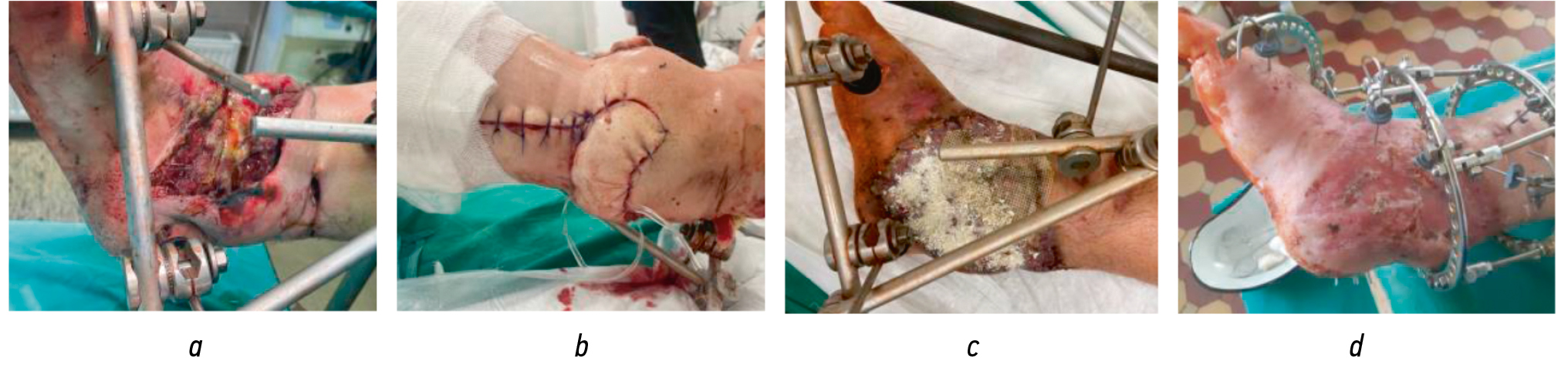 Fig. 8. Right leg and foot wound with a soft tissue defect in the lower third of the leg and comminuted fractures: а — appearance of an irregularly shaped wound (20 × 8 cm) in the lower third of the right leg after repeated surgical treatments; b — 25 days after injury, the sural flap on the vascular pedicle is fixed to the defect area; с — 38 days after injury, repeated autoplasty with free split skin grafts. Crushed lyophilized hydrogels from the acellular human umbilical cord were applied on top of the grafts; d — appearance of the defect area 80 days after injury