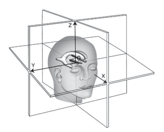 В клиническом стереотаксисе прямоугольная система координат мозга строится по внутримозговым ориентирам, для чего чаще всего используют переднюю и заднюю комиссуры мозга. Ось х проходит через центры комиссур от затылка ко лбу, начало координат 0 – середина расстояния между коммиссурами, ось z проходит от базальных отделов мозга к темени, ось y – слева направо (рис. 1).