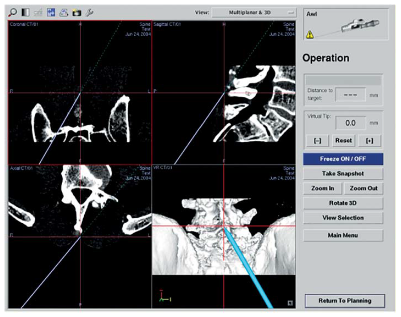 Нейронавигация для операций на позвоночнике позволила качественно увеличить точность и объем резекций кости, повысила позиционирование имплантов. При этом количество снимков электронно-оптического преобразователя (ЭОП) при использовании навигации значительно снижается.