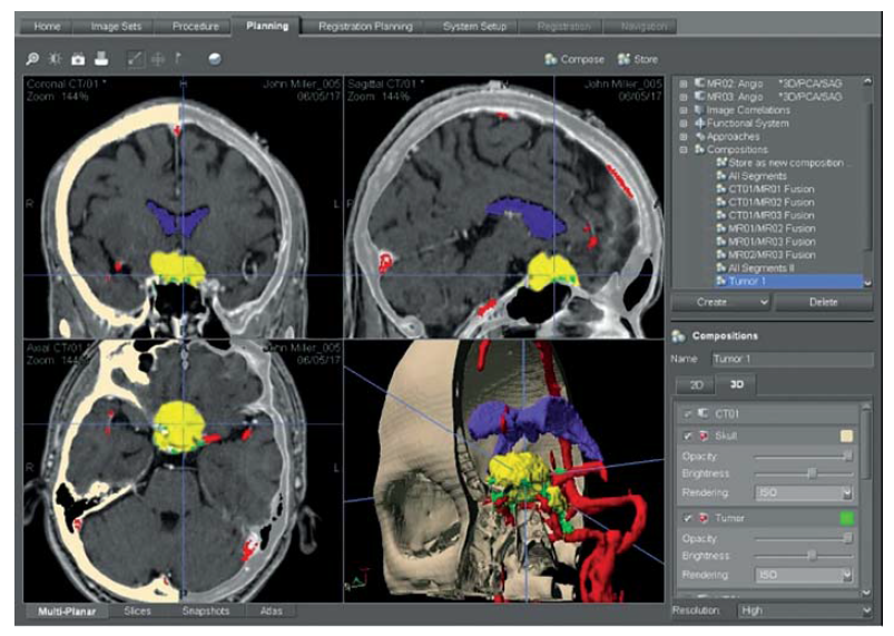 – детальное предоперационное планирование с расчетом координат и объема патологического очага и траектории доступа к нему (снижает время работы на открытом мозге, при постоянной практике – общее время операции);