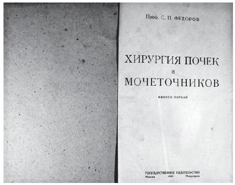 Монография «Хирургия почек и мочеточников» [15], вышедшая в 1923–1925 гг., явилась большим событием в урологической литературе по изложению колоссального опыта ее автора [11]. С.П. Федоров подчеркнул по этому поводу, что книга должна быть не просто описательной, в ней необходимо отразить личное мнение автора, основанное на опыте, достаточном для того, чтобы он имел право критиковать мнения, встречающиеся в других руководствах, а также предлагать то, что является наиболее правильным и ценным.