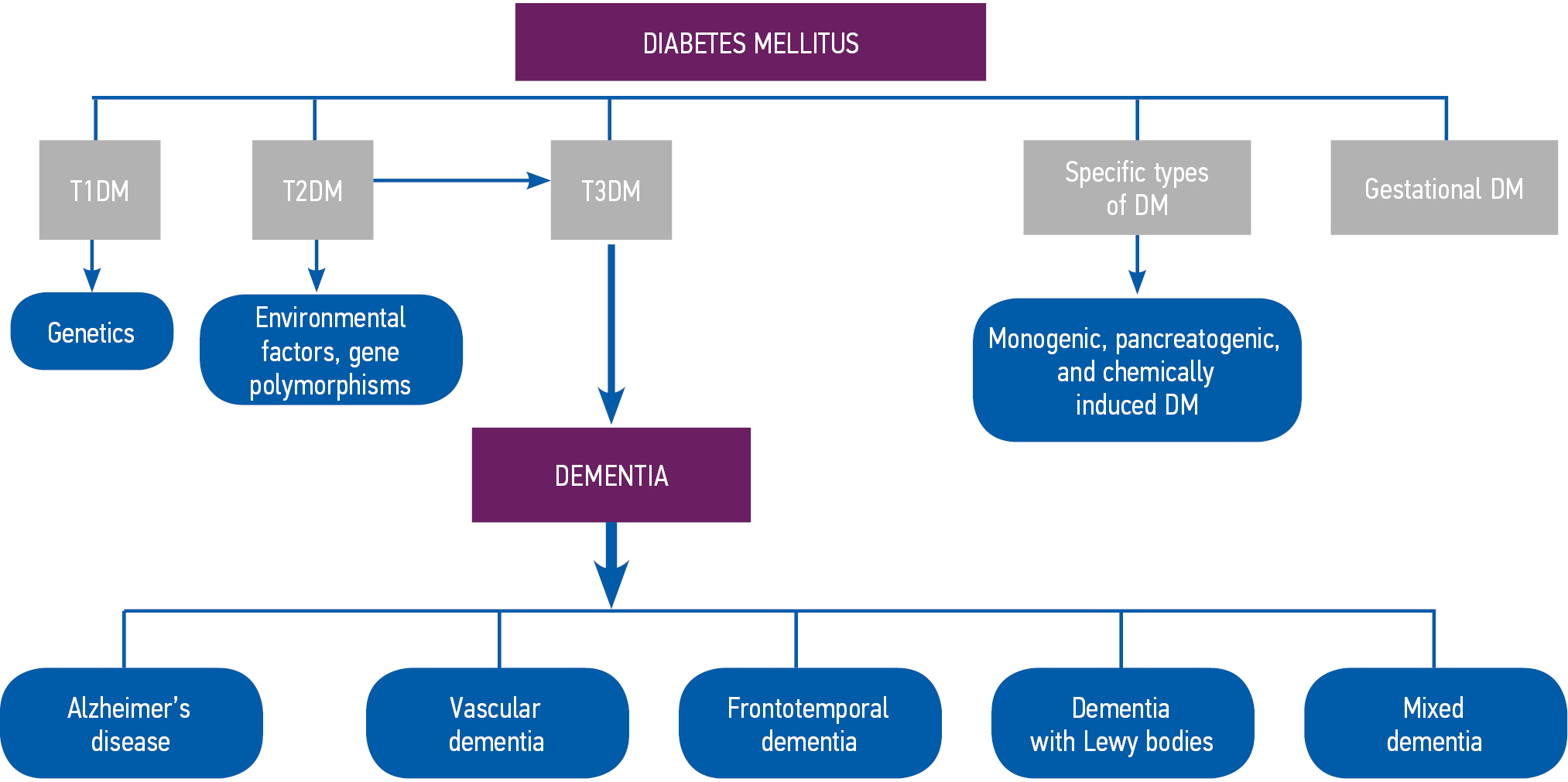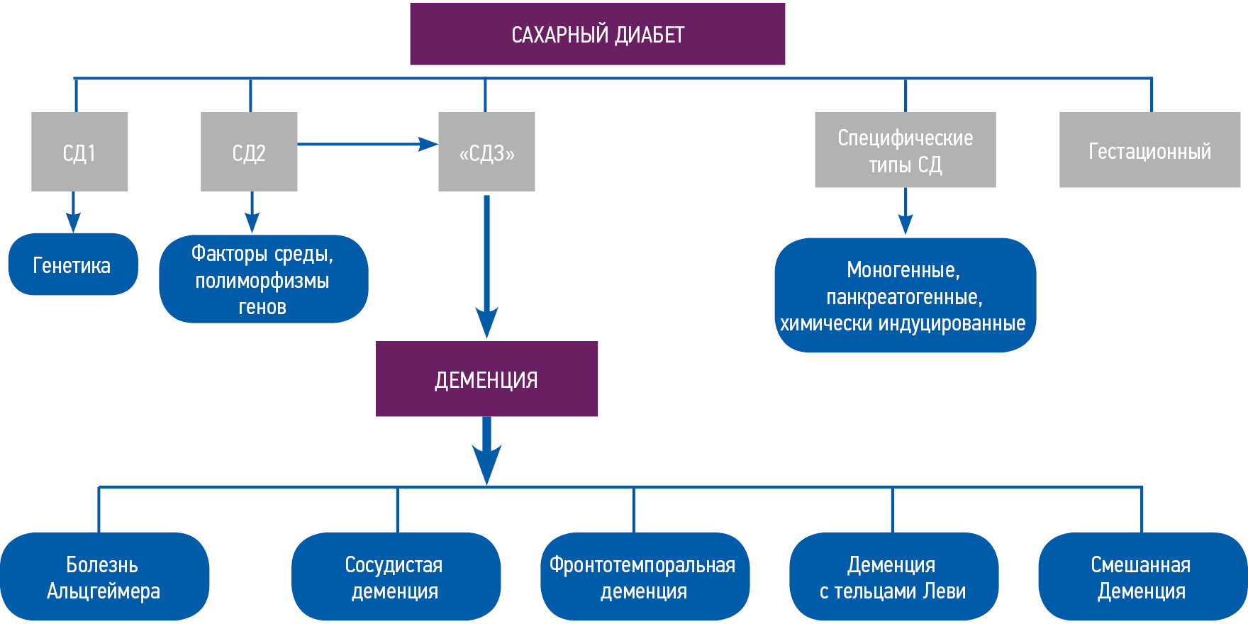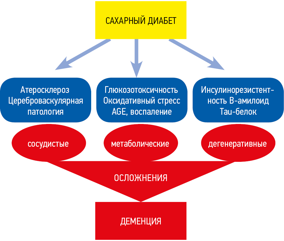 This review aimed to analyze the data of current Russian and foreign scientific studies on the etiology and pathogenetic mechanisms of dementia in patients with T2DM.