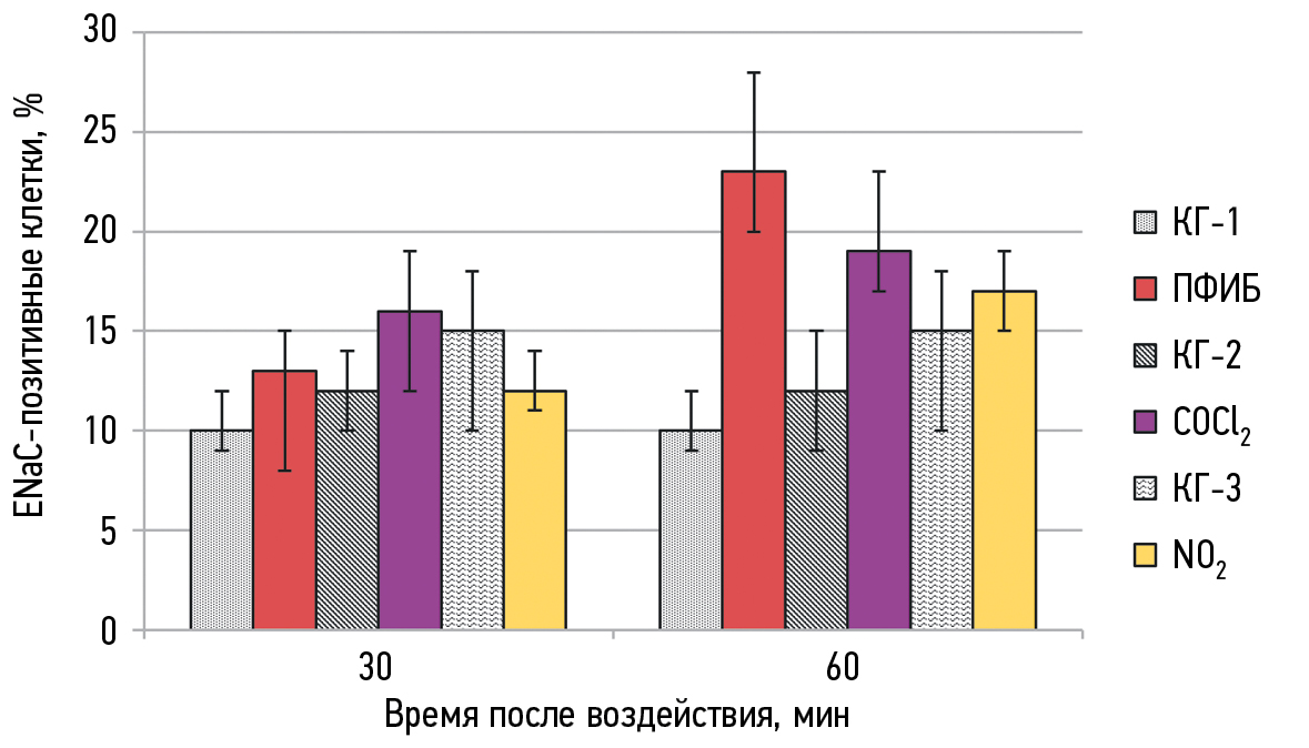 Notably, at 30 min postexposure, no significant changes in the pulmonary coefficient were detected in the rats exposed to the acylating agents. This might be attributed to enhanced alveolar clearance via ENaC, as a significant increase in ENaC expression on alveolocytes was evident at 30 minutes postexposure. Y. Berthiaume et al. [5] demonstrated in lung injury models associated with alveolar fluid accumulation that increased alveolar clearance occurs due to elevated ENaC expression in alveolocytes.