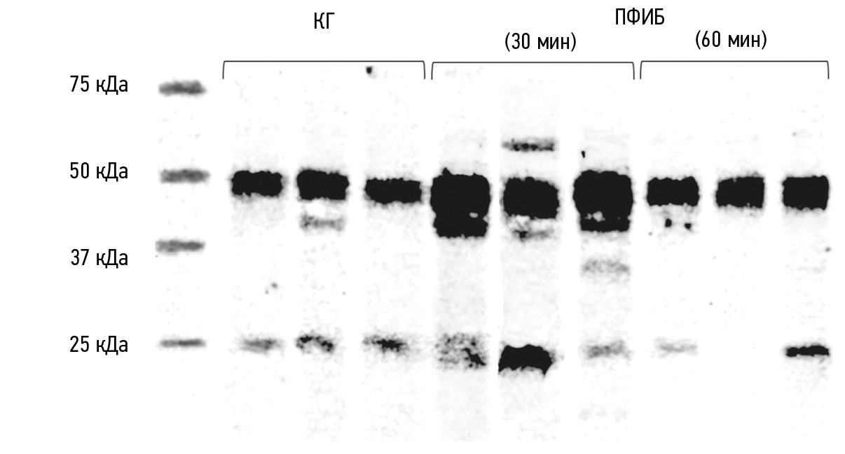 Рис. 7. Вестерн-блот-анализ содержания AQP-5 в гомогенатах тканей легких крыс группы ПФИБ, полученных через 30 и 60 мин после воздействия продуктов термодеструкции фторопласта