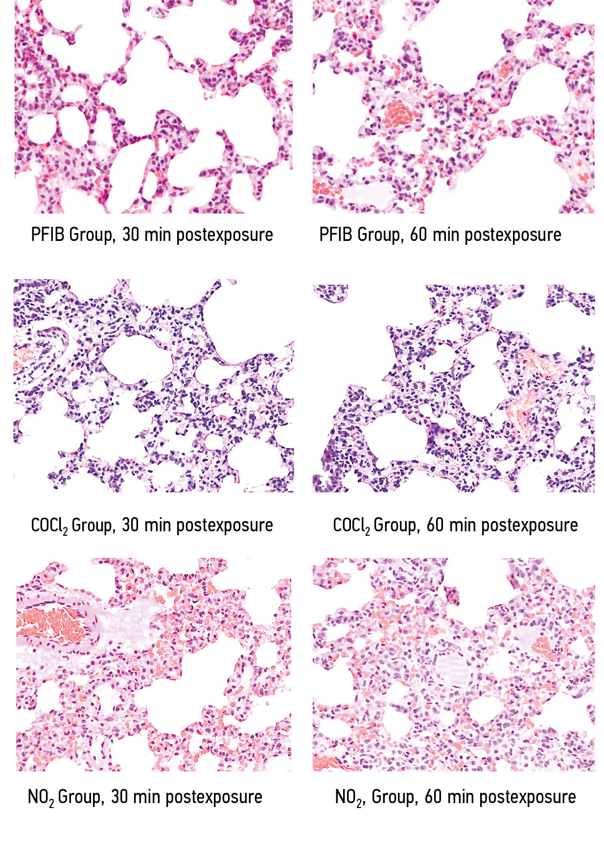 The spectrum of substances with pneumotoxic effects is diverse, and classical pneumotoxicants include substances that disrupt the respiratory system’s structure and function upon inhalation. Based on their mechanism of action, pneumotoxicants can be classified into acylating agents, such as carbonyl chloride (COCl2) and perfluoroisobutylene (PFIB), and substances that trigger protein coagulation and free radical oxidation processes in the aero-hematic barrier, such as nitrogen dioxide (NO2). Acylating agent intoxication can occur due to accidents at chemical hazard sites, combustion of fluoroplast in fires, or the use of chemical weapons. NO2 is a component of propellant and explosive gases, and exposure to it can occur in poorly ventilated shooting ranges and during the detonation of munitions [1–4].