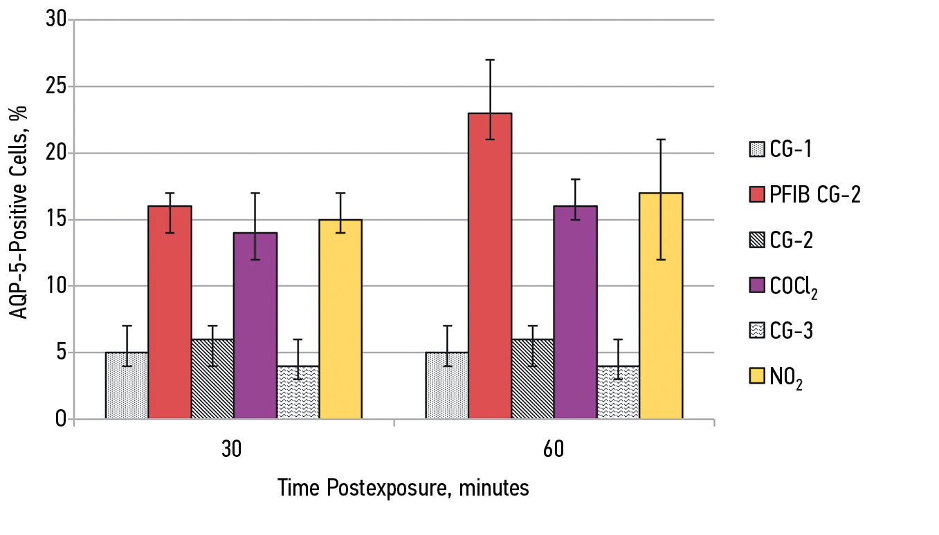 Immunohistochemical analysis demonstrated a significant (p < 0.05) increase in AQP-5-positive cells at 30 and 60 minutes postexposure to all studied toxicants compared with CG-1, CG-2, and CG-3. The highest accumulation of AQP-5-positive cells and extravascular fluid was observed in the lung tissues of the PFIB-exposed rats at 60 minutes postexposure to the PFIB thermal degradation products (Fig. 3 and 4).