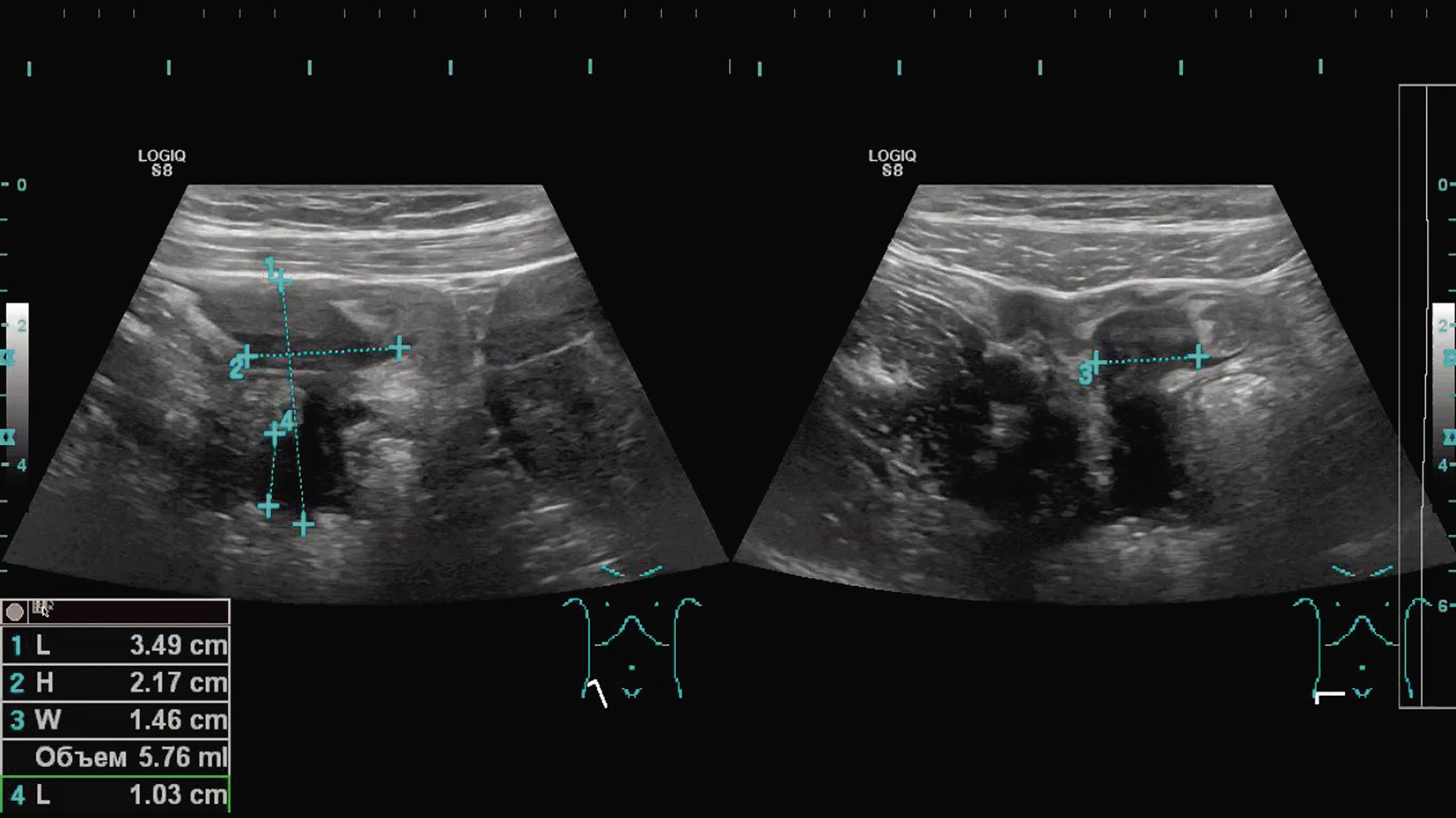 При ультразвуковом исследовании (УЗИ) органов брюшной полости особых изменений не обнаружено. Печень не увеличена, контуры ее четкие, ровные, структура однородная, эхогенность не изменена, сосудистый рисунок не деформирован, внутрипеченочные протоки не расширены. Очаговые изменения не выявлены. Желчный пузырь не увеличен. Его форма обычная, стенка не изменена, содержимое однородное, перивезикальные ткани не изменены. Общий желчный проток не расширен, прослеживается до головки поджелудочной железы, внутрипросветные образования не выявлены. Поджелудочная железа не увеличена. Контуры ее четкие, ровные, структура однородная, эхогенность равна печени. Главный панкреатический проток не расширен. Селезенка не увеличена. Контуры ее четкие, ровные, визуализируемые участки капсулы не изменены. Паренхима однородная. Дополнительные образования в паралиенальном пространстве не определяются. Брюшной отдел аорты не расширен. В проекции выходного отдела желудка патологические изменения не выявлены. В правой подвздошной области илеоцекальный переход не изменен, аппендикулярный отросток достоверно не визуализируется. Проксимальнее по ходу подвздошной кишки, межпетельно на уровне ниже ветвления правой общей подвздошной артерии лоцируется образование размерами 35 × 22 × 15 мм, достигающее стенки таза. Форма его неправильная, структура неоднородная, низкой эхогенности. Аваскулярное образование фиксировано к поверхностно лежащим петлям тонкой кишки, к брюшине не фиксировано (рис. 1).