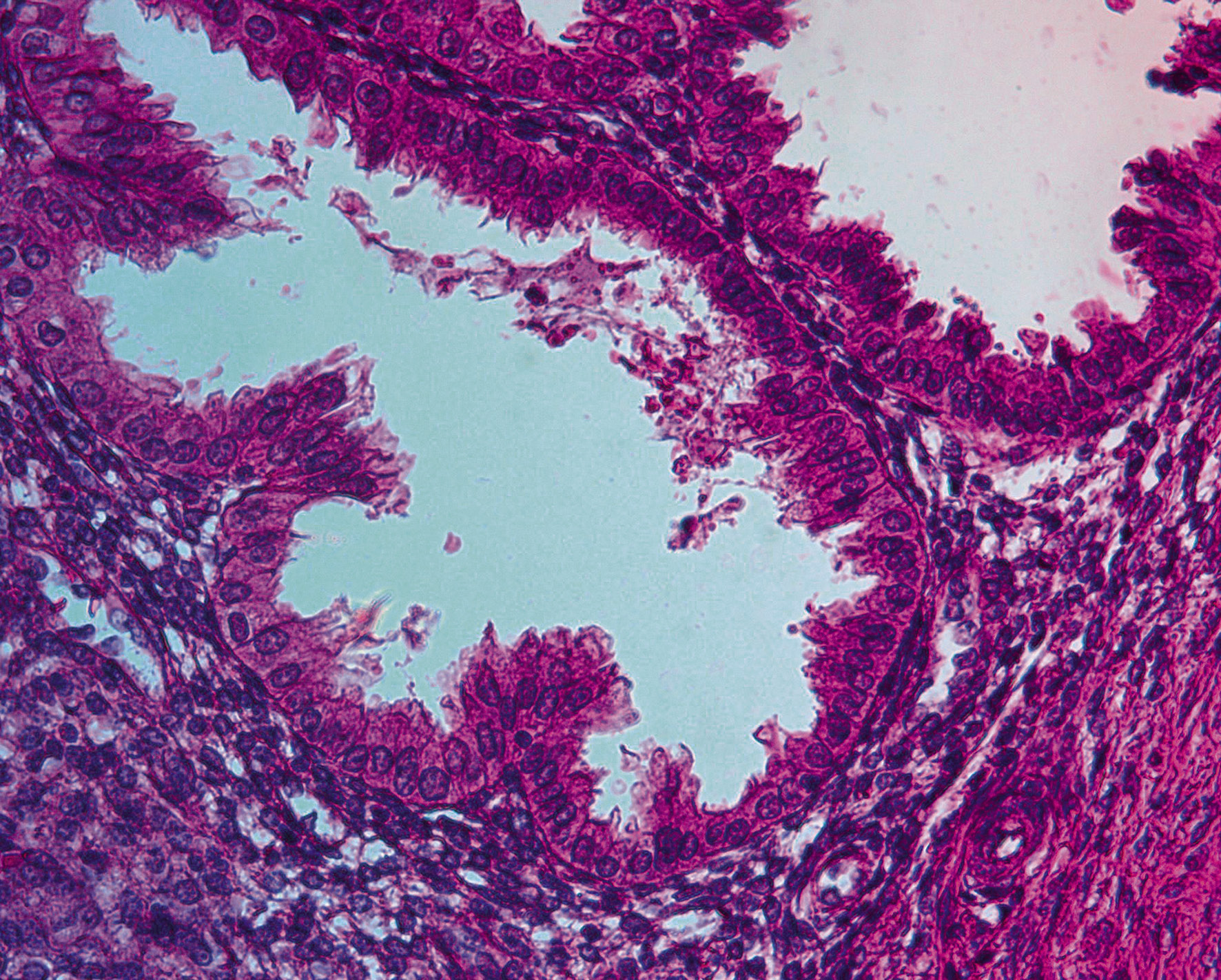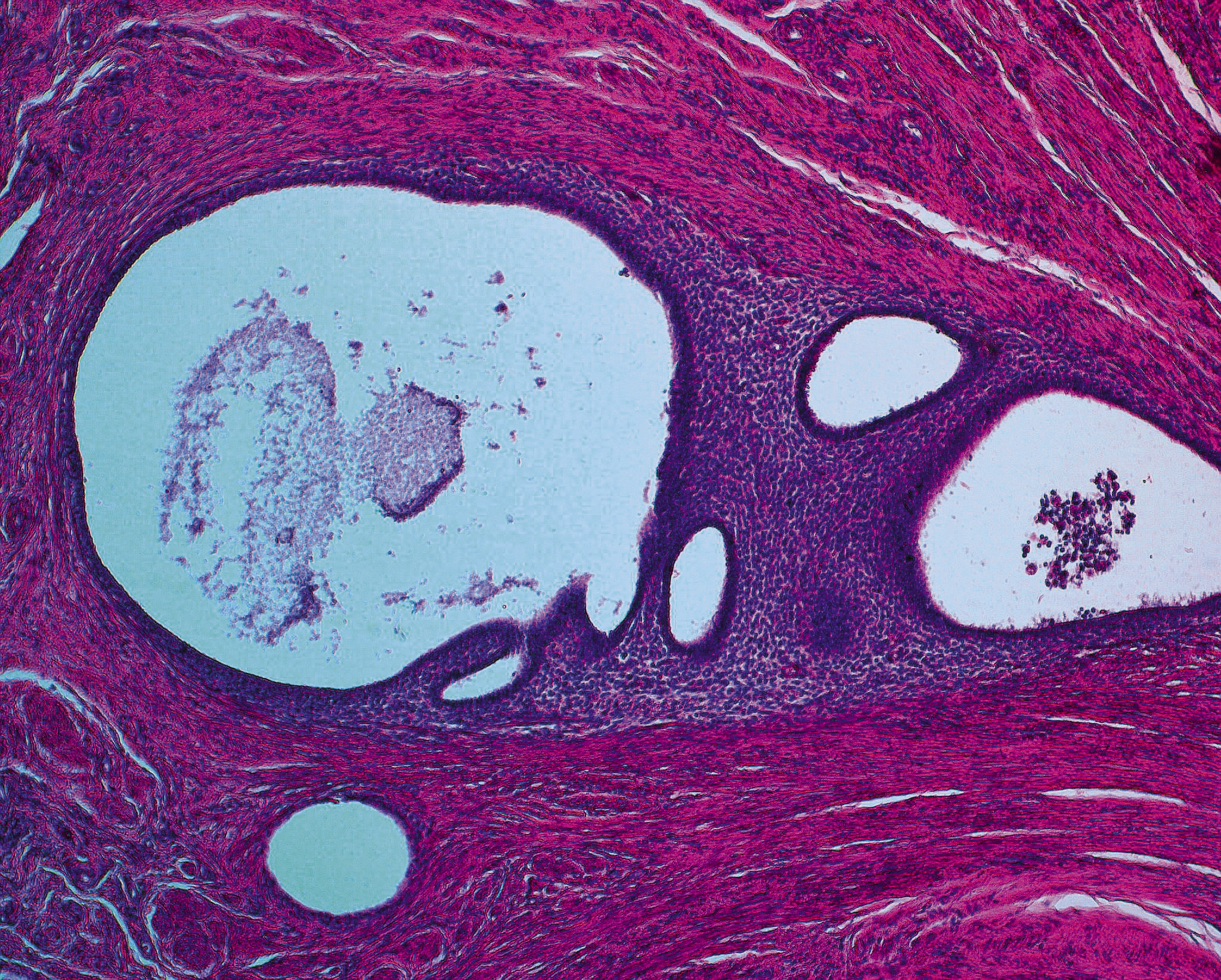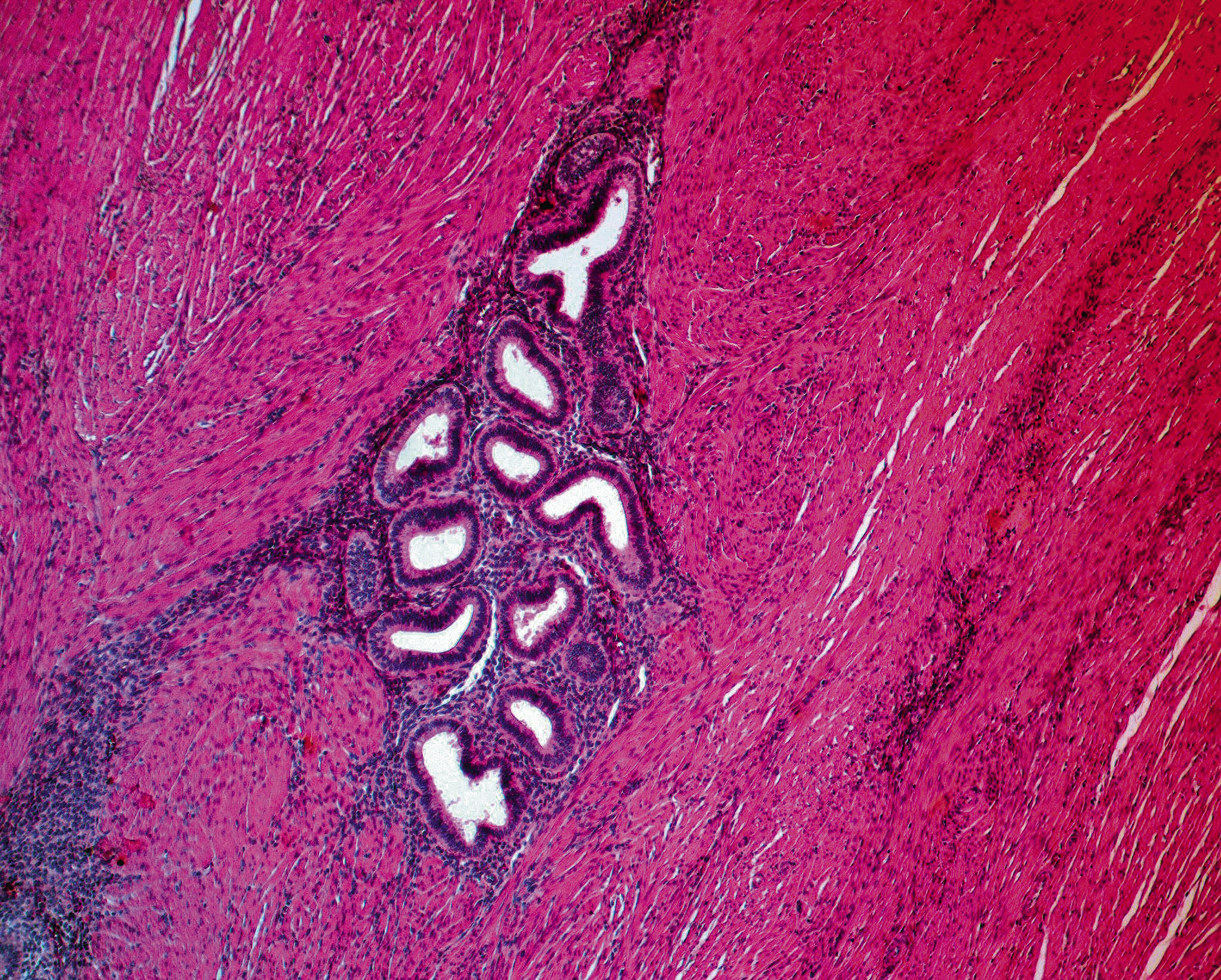 При микроскопическом исследовании фрагментов из измененных участков стенки тонкой кишки и мышечного слоя стенки аппендикса видны множественные диффузно расположенные очаги эндометриоза эпителиально-стромального строения, представленные цитогенной стромой и железами, выстланными однорядным эндометриальным эпителием (рис. 4).