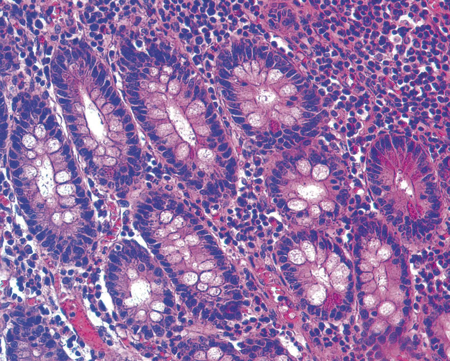 Рис. 8. Участок слизистой тонкой кишки с выраженной лимфоцитарной инфильтрацией стромы. Окраска гематоксилином и эозином, ув. ×180 / Fig. 8. A site of the mucous membrane of the small intestine with pronounced lymphocytic infiltration of the stroma. Coloring hematoxylin-eosin, enl. ×180 times