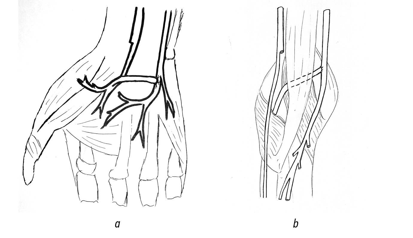 По данным нашего целенаправленного исследования сосудисто-нервных пучков ладонной области кисти, двигательная ветвь срединного нерва для мышц возвышения I пальца (нерв-реципиент) занимает на уровне запястья самое латеральное положение в составе срединного нерва при условии расположения кисти в позиции супинации. На относительно узких и длинных конечностях данная ветвь может быть мобилизована, включая выделение составляющих ее пучков из состава срединного нерва, до уровня лучезапястного сустава. После визуализации глубокой ветви локтевого нерва (нерв-донор) на ее наружной поверхности вскрывают эпиневральную оболочку, и на уровне предполагаемого соединения на одном или нескольких пучках из состава глубокой ветви локтевого нерва хирургическим способом формируется дефект периневрия, равный диаметру нерва-реципиента. Периневральный футляр двигательной ветви срединного нерва соединяют по типу «конец-в-бок» микрохирургическими швами с краями дефекта периневрия глубокой ветви локтевого нерва.