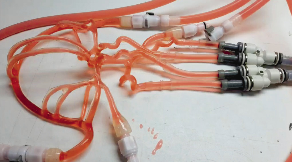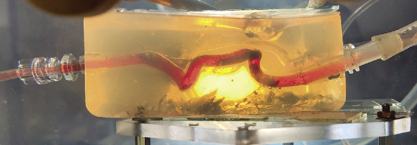 Отливка модели артериального русла выполнялась с сохранением особенностей наружного контура сосудов, а также внутреннего рельефа артерий и созданием посадочного места для участка интимы, куда, собственно, и помещался операционный материал этого пациента. Затем полученный на 3D-принтере интересующий сегмент артериального русла включался в собранный стенд для исследования особенностей гемодинамики, представляющий собой контур с перфузионным насосом, обеспечивающий пульсирующий кровоток, — фантом участка бифуркации сонных артерий и симулятор русла оттока (рис. 3, 4).