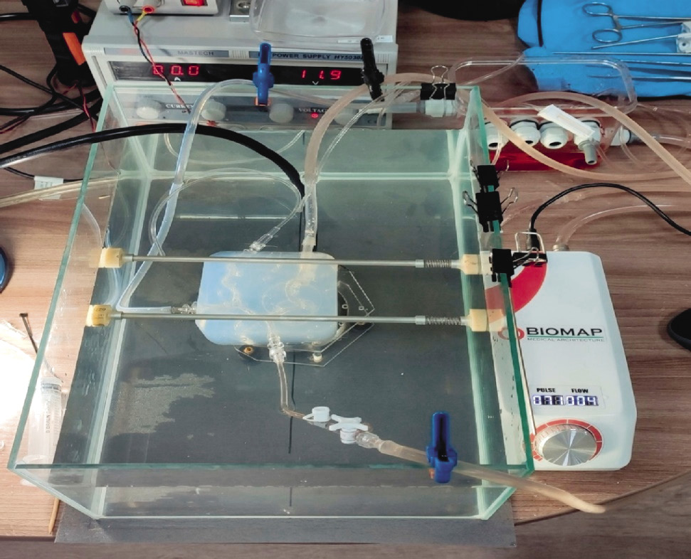 Рис. 4. Собранный для исследований стенд, включающий фантом, симулятор русла оттока и перфузионный насос