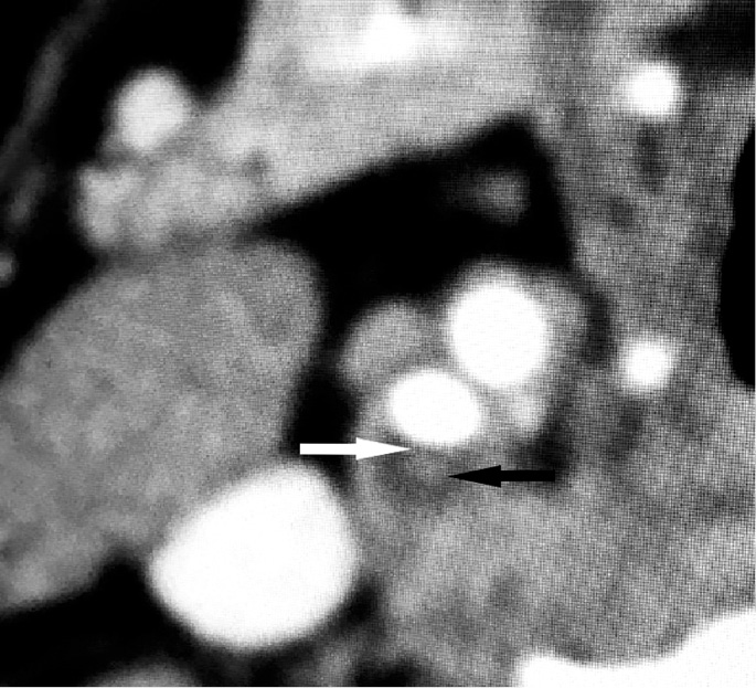 Рис. 5. Компьютерная томограмма пациента с нестабильной атеросклеротической бляшкой. Определяется единая большая полость внутри бляшки с жидкостным компонентом (черная стрелка) и истонченная покрышка (белая стрелка)