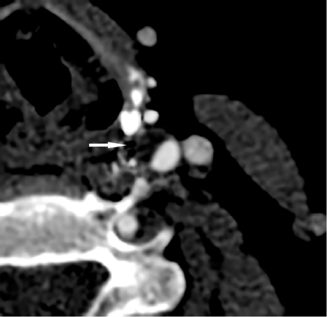 Fig. 6. Сomputed thomography scan of a patient with unstable atherosclerotic plaque. A multi-chambered cavity inside an atherosclerotic plaque with a fluid component is determined (white arrow)