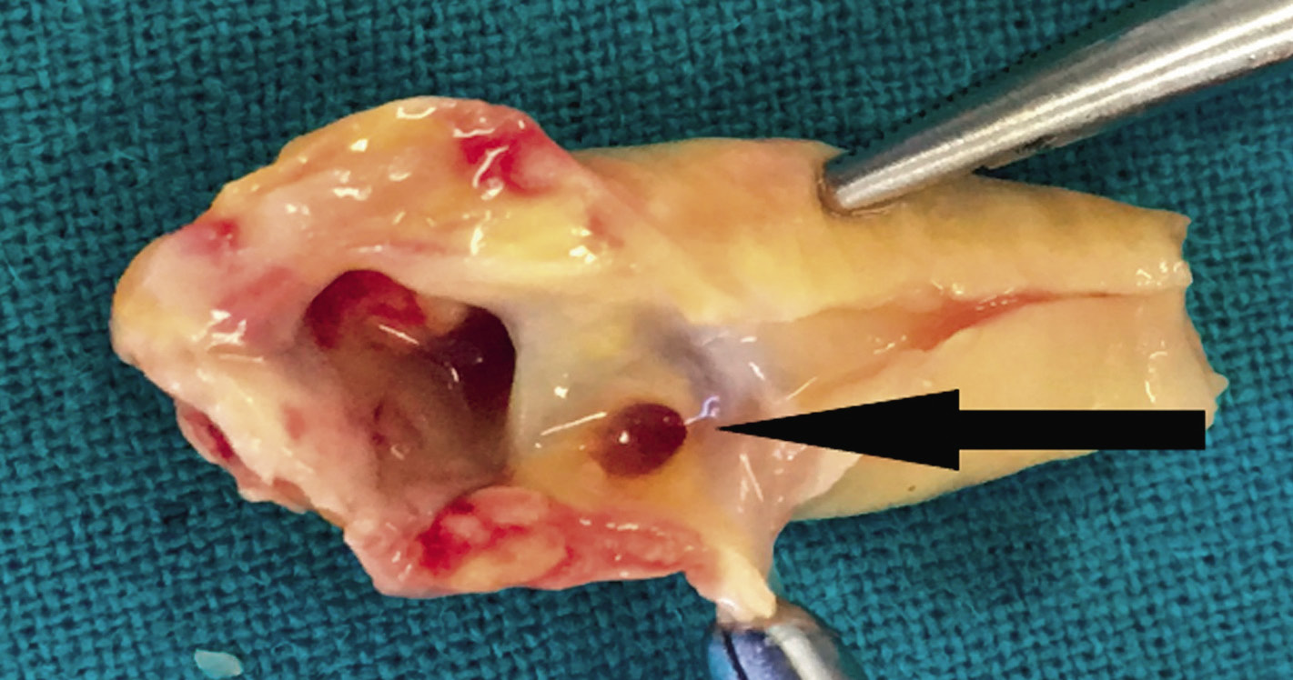 У 100% пациентов под эндотрахеальным наркозом была выполнена эверсионная эндартерэктомия из внутренней сонной артерии (ВСА). Полученный материал представлял собой неповрежденный кольцевидный участок атеросклеротически измененной интимы с бляшкой (рис. 1).