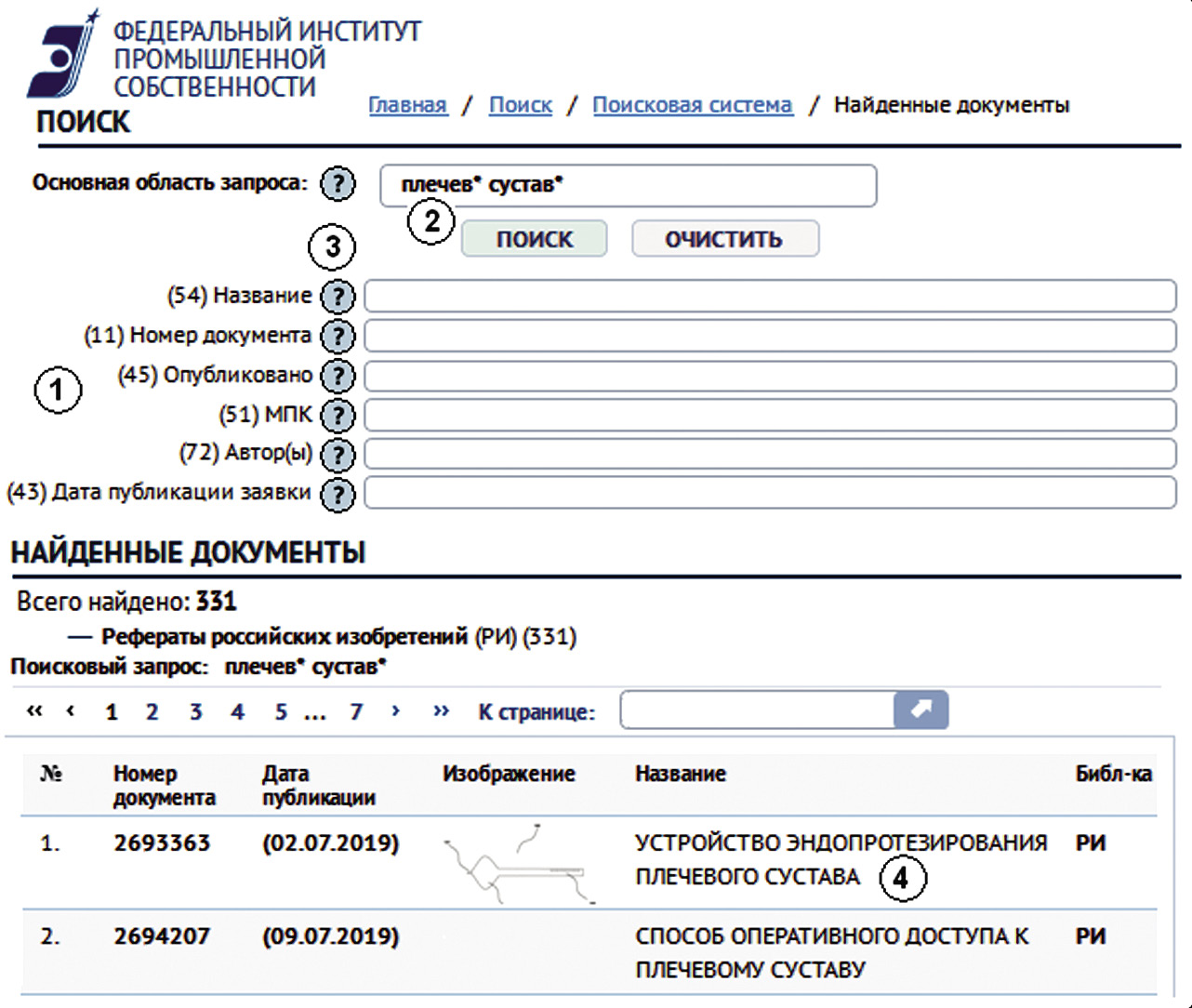 Поиск отечественных изобретений проводили на сайте Федерального института промышленной собственности Роспатента. Использовали опцию «Поиск» и открывали страницу поисковых режимов. В массиве «Рефераты российских изобретений» в окне «Основная область запроса» (рис. 1) поочередно указывали усеченные поисковые слова (плечевой сустав, плечевая кость и др.), соединенные операторами поиска. На поисковой странице «Рефераты российских изобретений» представлены 25 режимов поиска (cм. рис. 1, п. 1): по названию документа или номеру его регистрации, по авторам, патентообладателям, заявителям, дате публикации, рубрике по МПК и др. Задав в основную область запроса выражение «плеч* сустав*», получили 331 отклик на изобретение (см. рис. 1, п. 2). Каждый режим поиска имеет подсказку (?) ввода данных (см. рис. 1, п. 3). Оптимизация поиска осуществляется с помощью операторов: AND, OR, NOT, WITHIN, ADJ *, (), « « и др. Подробные сведения о поиске патентов описаны Э.П. Скорняковым, М.Э. Горбуновой [12].