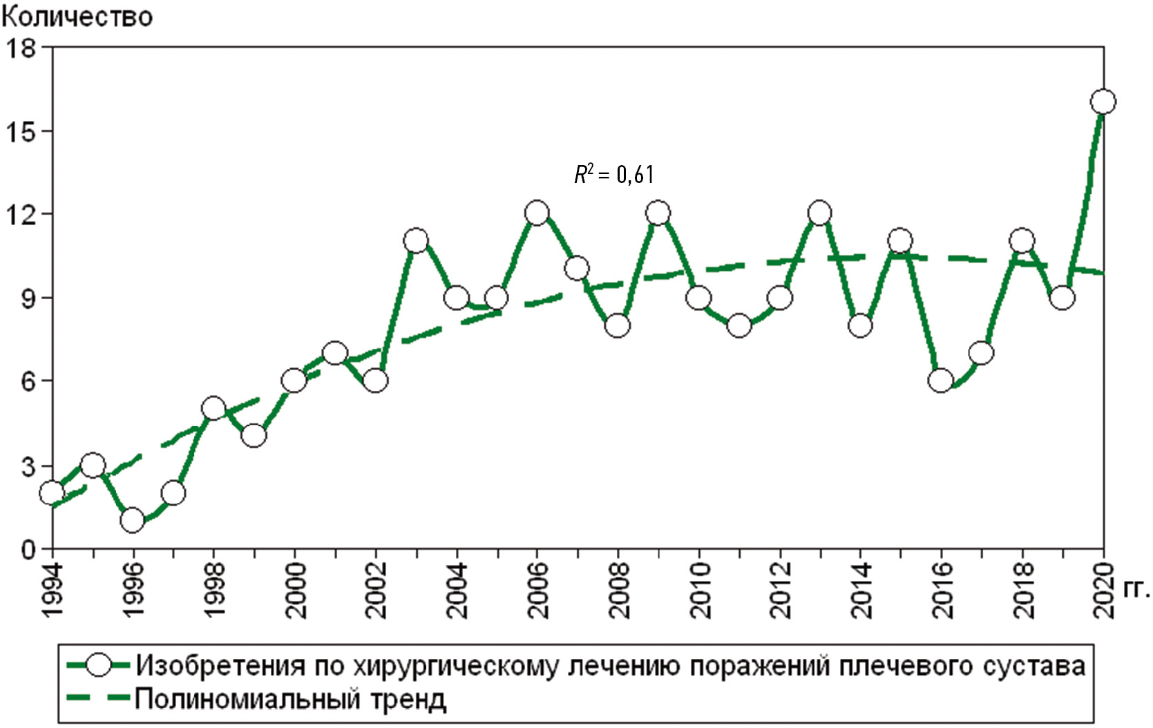 Сформирован отечественный массив из 215 патентов на изобретения по хирургическому лечению заболеваний и травм плечевого сустава, зарегистрированных в Роспатенте, в основном с 1994 по 30.09.2020. Среднегодовое количество патентов на изобретения составило 7 ± 1. Полиномиальный тренд при высоком коэффициенте детерминации (R2 = 0,66) демонстрировал рост данных, увеличение интереса изобретателей к способам и устройствам оптимизации хирургического лечения поражений плечевого сустава (рис. 2).