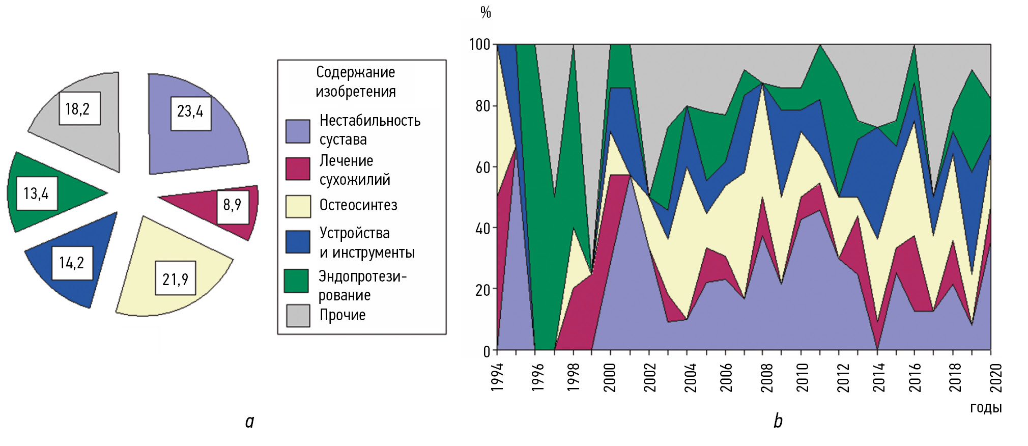 Fig. 3.Structure (a) and dynamics of the structure (b) of inventions in the surgical treatment of shoulder joint lesions