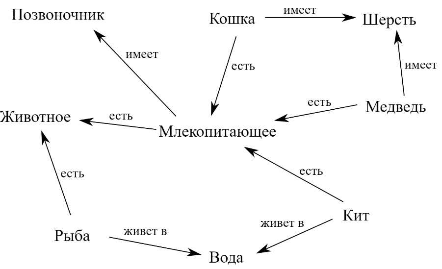 Семантическая сеть (СС) как модель предметной области для дифференциальной диагностики — это информационная модель предметной области, имеющая вид ориентированного графа, вершины которого соответствуют объектам предметной области, а дуги (ребра) задают отношения между ними [12–14, 18]. Объектами могут быть понятия, события, свойства, процессы. Таким образом, СС — это один из способов представления знаний. Основная форма представления СС — это граф. Понятия СС записываются в овалах или прямоугольниках и соединяются стрелками с подписями — дугами (рис. 2).
