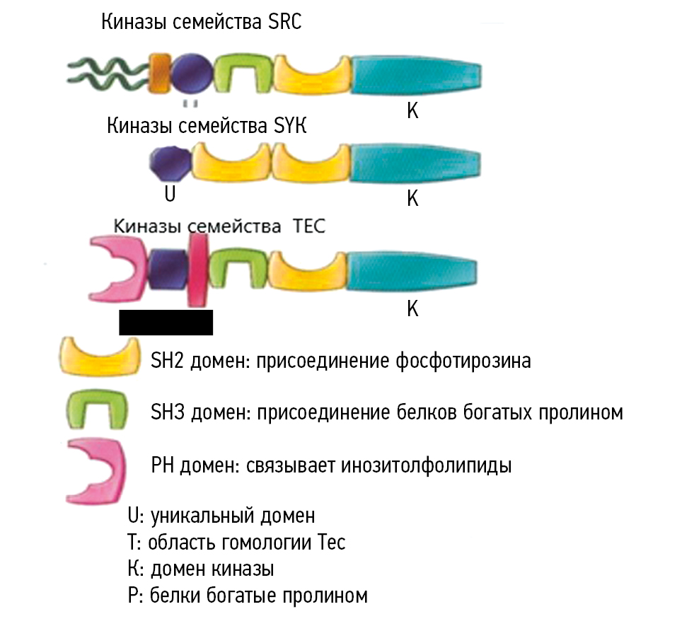 Рис. 1. Модульная структура тирозинкиназ, влияющих на активацию лимфоцитов: PH — домен гомолога плекстрина; SH — домен гомолога SRC (адаптировано из [19] A.K. Abbas и соавт., 2022. Распространяется на условиях лицензии CC-BY 4.0)