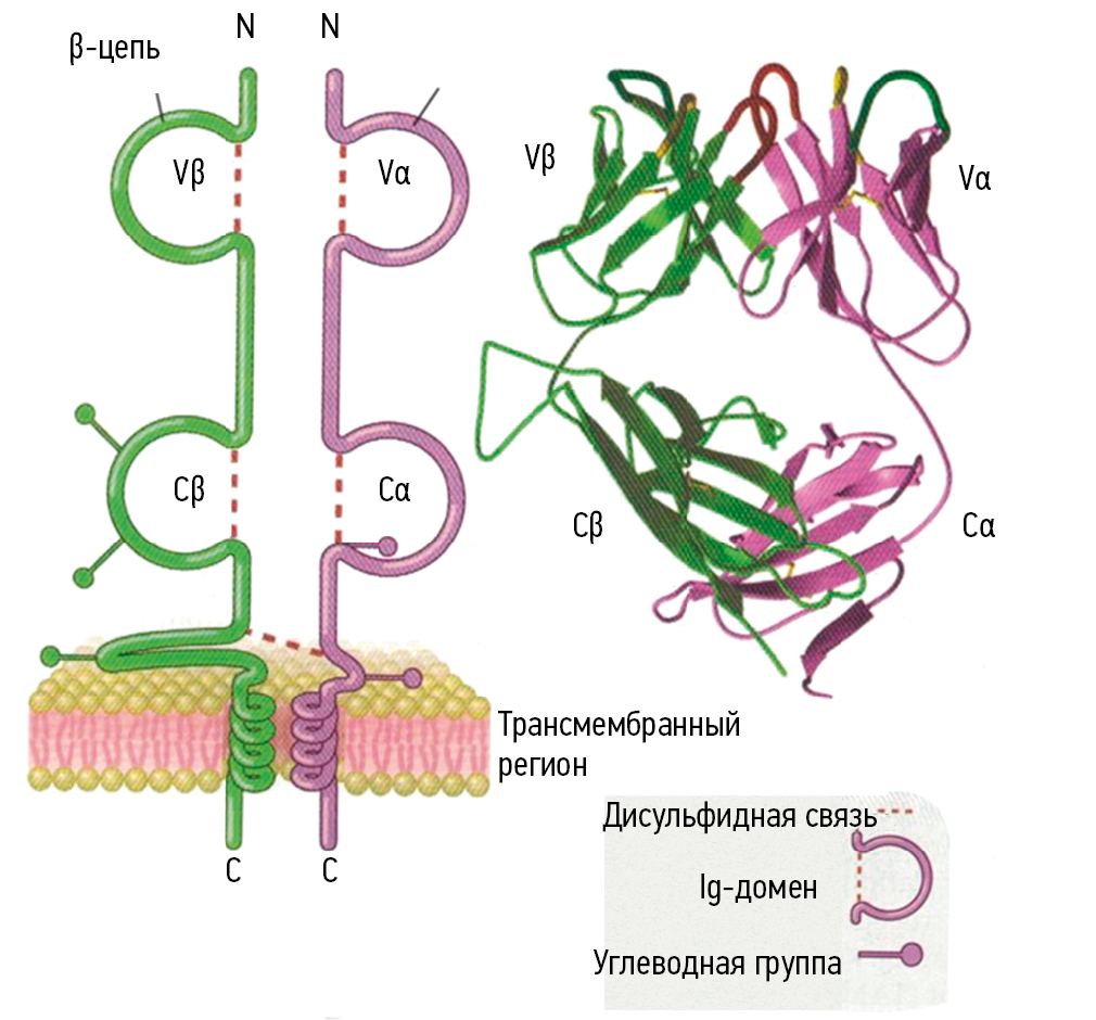 Рис. 3. Структура Т-клеточного рецептора: N, С — концевые внеклеточные области; Vβ, Vα — вариабельные домены α и β цепей; Сβ, Сα — константные домены α и β цепей (адаптировано из [19] A.K. Abbas и соавт., 2022. Распространяется на условиях лицензии CC-BY 4.0)