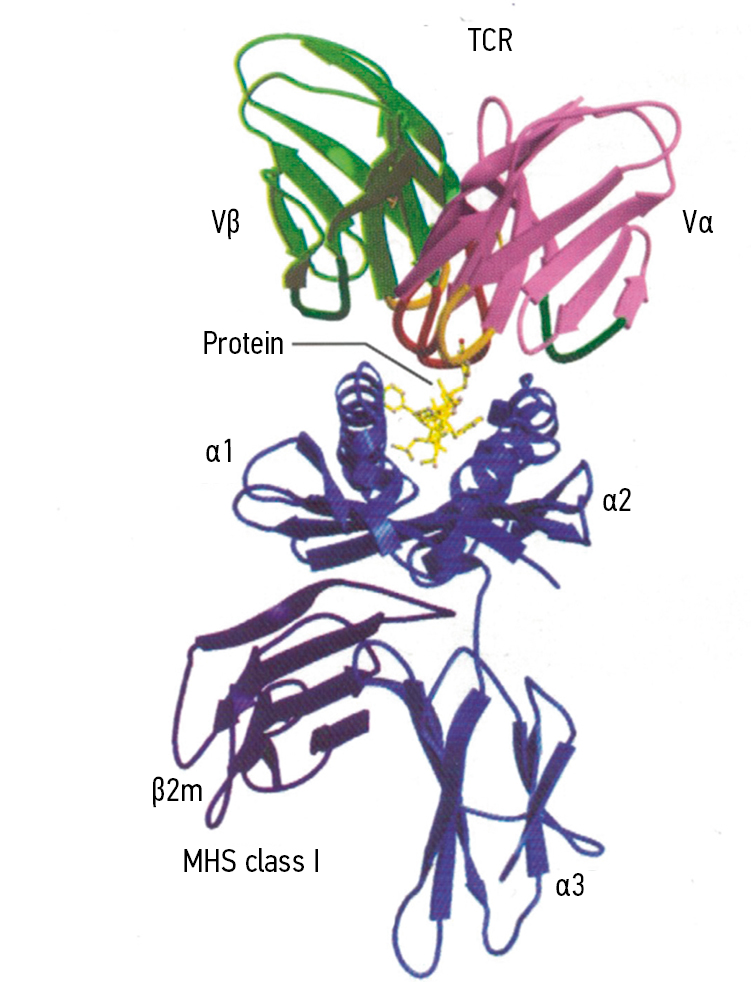 Fig. 4. T-cell receptor binding to the major histocompatibility complex: β2m — beta-2 microglobulin; α1–3 chains (adapted from [19] A.K. Abbas et al., 2022. Distributed under the terms of the CC-BY 4.0 license)