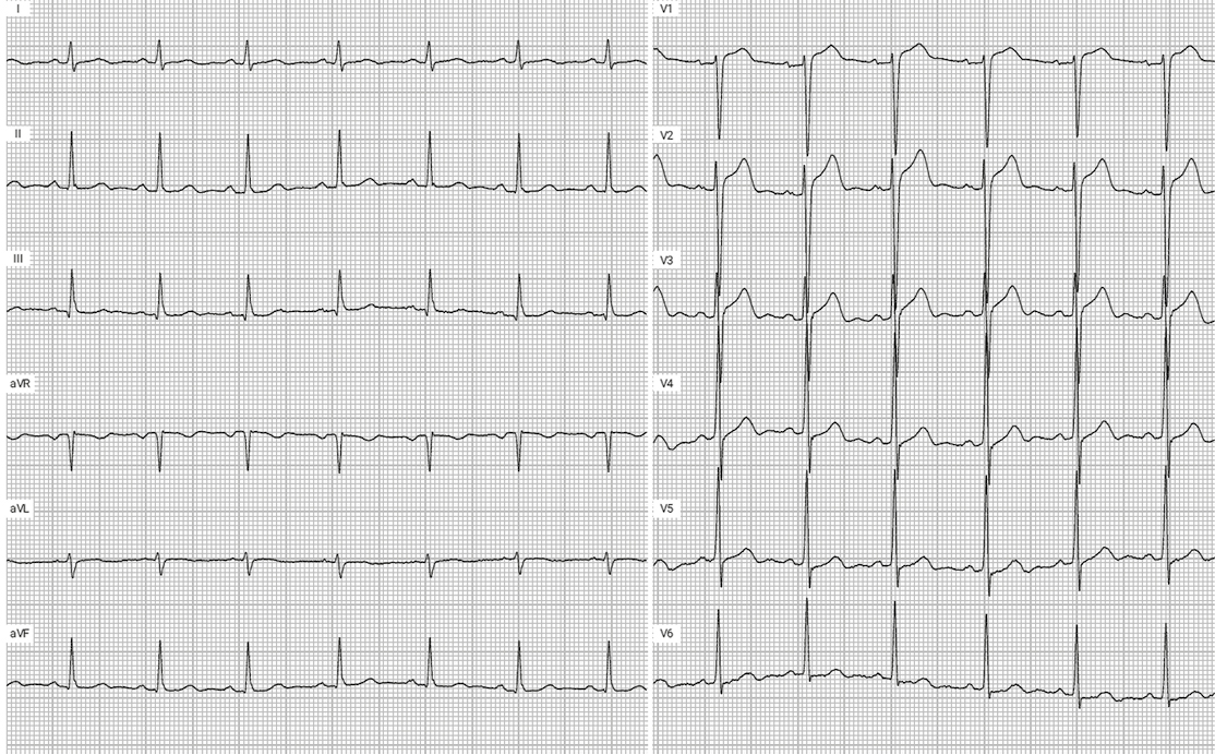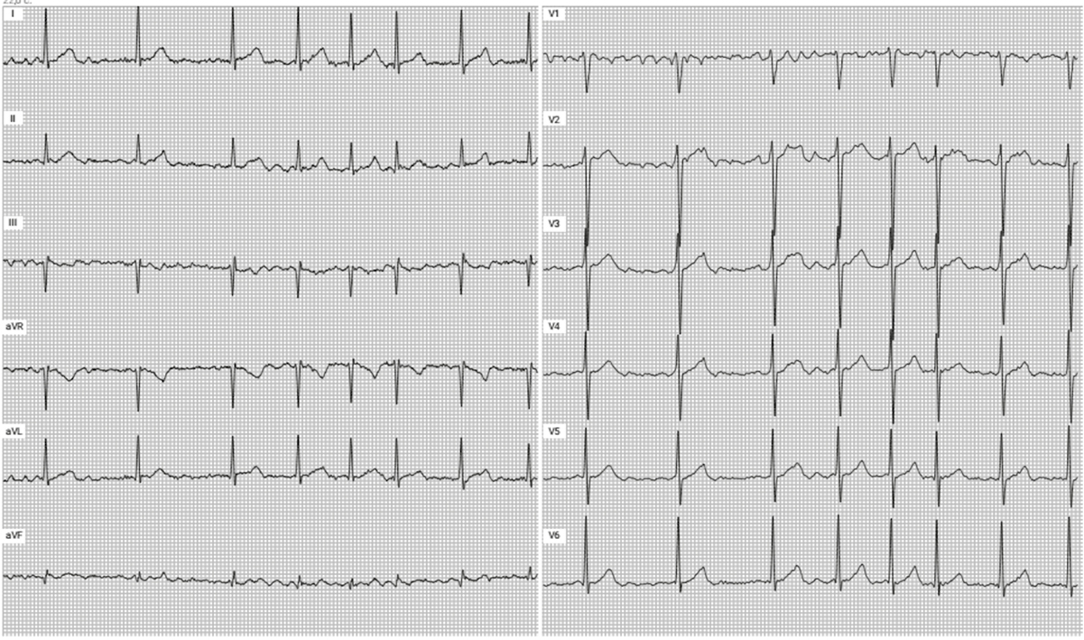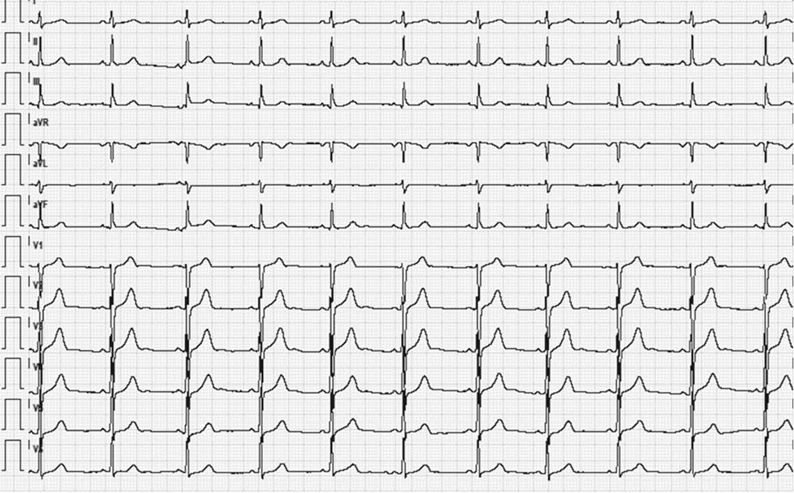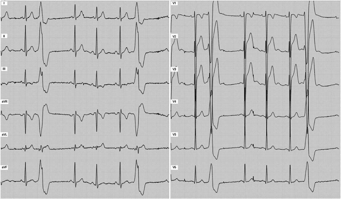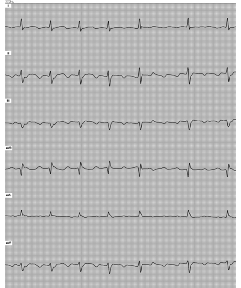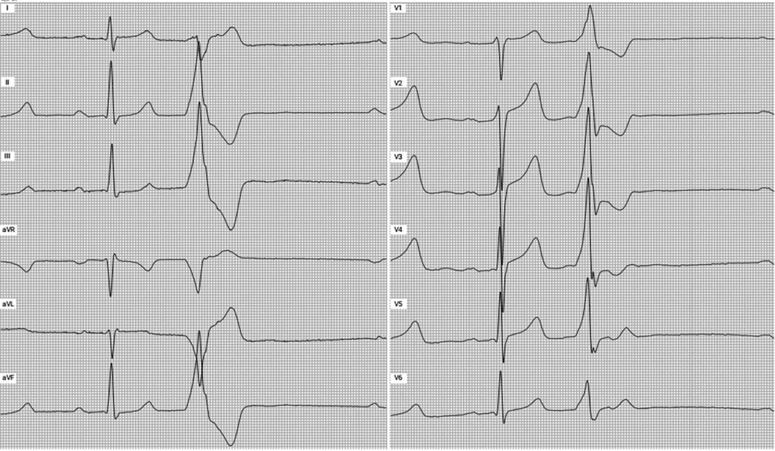 Рис. 7. Пациент С., 67 лет. Синусовый ритм. Нормальное положение ЭОС. Одиночная конкордантная базальная желудочковая экстрасистола