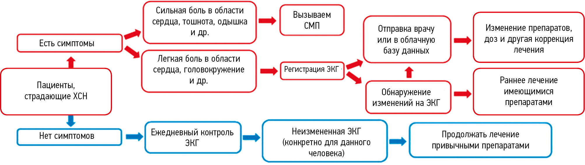 Рис. 9. Алгоритм использования мобильной системы ЭКГ-мониторинга у пациентов кардиологического профиля, страдающих ХСН. СМП — скорая медицинская помощь