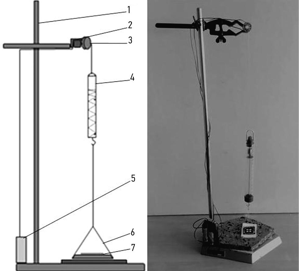 Fig. 1. The scheme of the experimental device: 1 — tripod, 2 — electric motor with reduction gear; 3 — block (roller); 4 — spring dynamometer; 5 — toggle switch; 6 — “basket”; and 7 — тachocomb plate 1×1 cm
