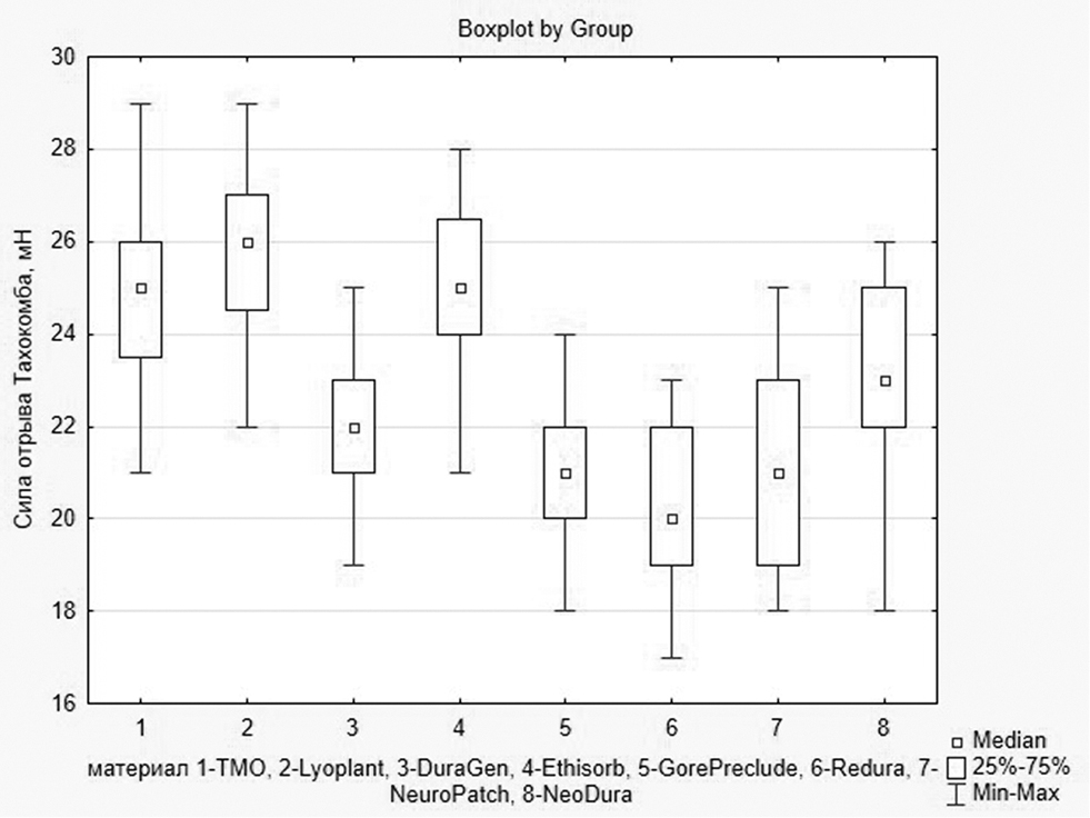 Для удобства визуальной оценки средних значений и вариабельности показателей адгезии «Тахокомба» к поверхностям исследованных материалов была построена гистограмма (рис. 5). Из рис. 5 видно, что полученные результаты адгезии к исследуемым протезам ТМО не выявляют статистически значимых отклонений от показателей нативной (кадаверной) ТМО.
