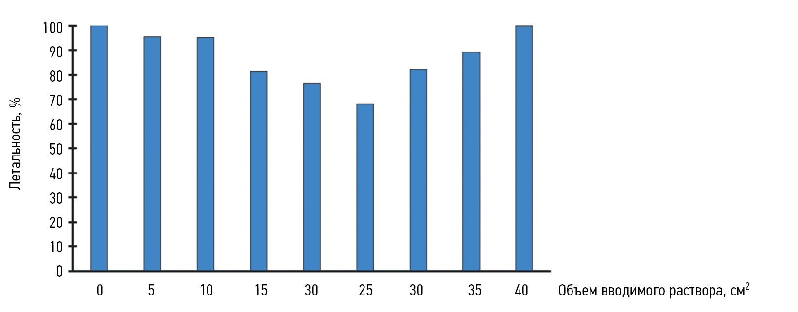 Данные, представленные на рис. 3, свидетельствуют о том, что противошоковая терапия в объеме 25 мл 0,9% раствора натрия хлорида способствовала достижению минимальной летальности животных (68,2%) в период реперфузии тканей после моделирования синдрома длительного сдавления и нанесения глубоких ожогов кожи на площади 30 см2. Уменьшение вводимого раствора до 20 мл или его увеличение до 30 мл способствовало изменению анализируемого показателя до 76,7 и 82,1 соответственно. Таким образом, наибольшая выживаемость животных отмечена при расчете объема 0,9% раствора натрия хлорида по модифицированный формуле Паркланда (мл) V = 6,5 × М × %, что на 39% больше относительно ее классического представления.