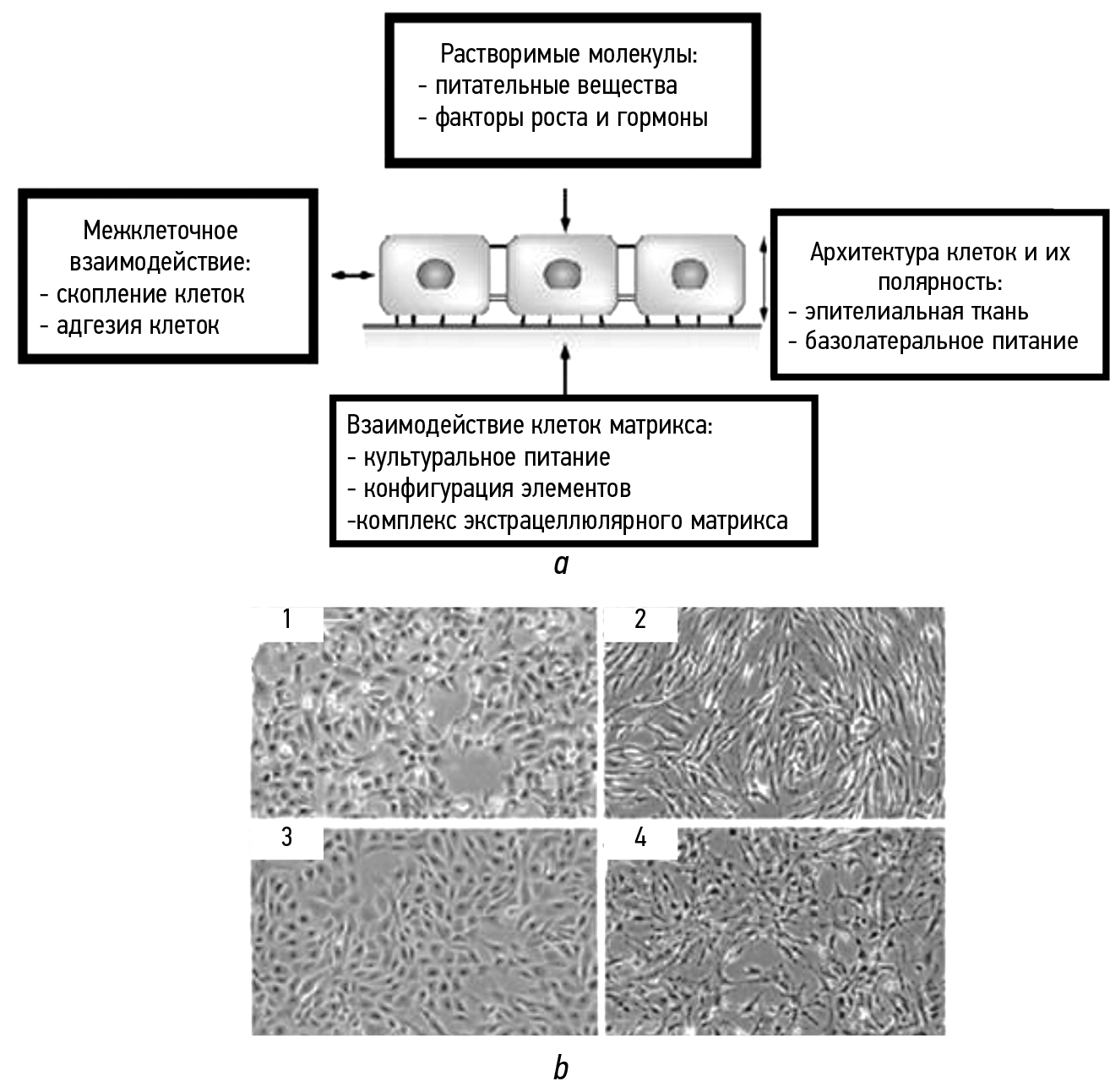 Рис. 1. Тканевые культуры: а — контроль клеточного микроокружения in vitro; b — различные типы клеток в культуре. 1 — эпителиальные (HeLa); 2 — фибробласты (молочной железы человека); 3 — эндотелиальные (CPAE), 4 — астроциты (человека)