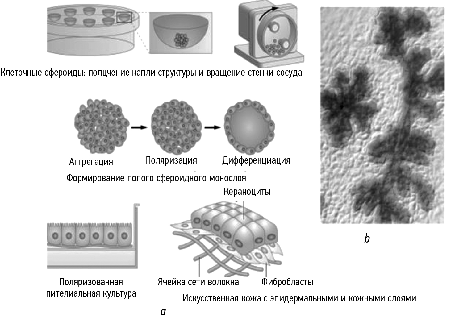 Большинство дифференцированных клеток в культуре не делятся, поэтому после дифференциации они статичны, пока не будут использоваться в эксперименте. Методы, которые индуцируют дифференцировку клеток в культуре тканей разнообразные, часто они подбираются эмпирически. Например, клетки мыши линии С2С12, состоящей из миобластов, могут дифференцироваться в мышечные трубочки, если ЭСТ заменяется сывороткой лошади. Близкие клетки к эритролейкемической клеточной линии могут дифференцироваться в эритроциты, если их обработать диметилсульфоксидом. Использование ПСК требует разработки методов тщательного контроля их дифференциации. Такие протоколы многоступенчатые, включают обработку клеток в соответствующие периоды со сменой 8 питательных сред, содержащих специфические ингредиенты, факторы роста, молекулы агонистов и антагонистов. Большинство КТ включает выращивание клеток на плоских, двухмерных поверхностях или в подложке. Разработаны различные методы выращивания культур в трех измерениях (рис. 2). Имеется достаточный опыт получения in vitro рудиментов органов (почки, легкого, слюнной железы) из эмбрионов млекопитающих [8, 18].