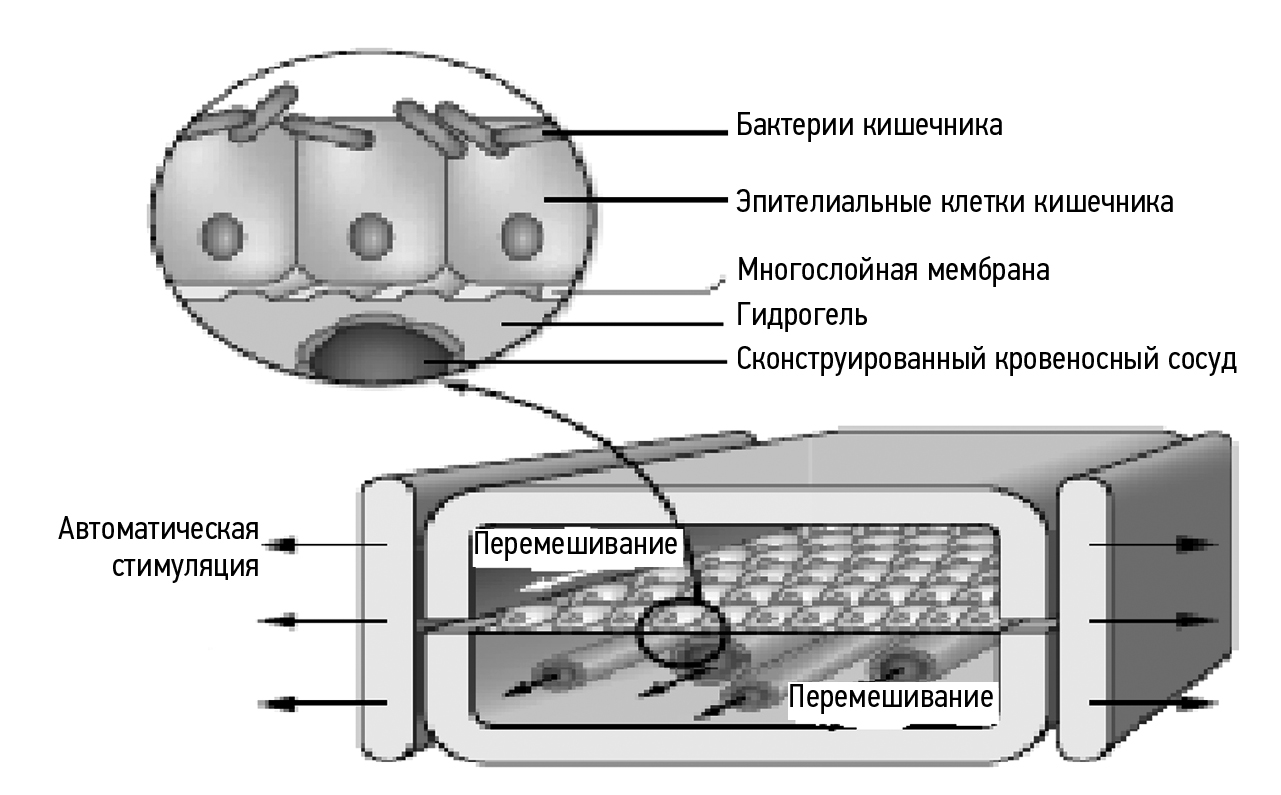 На рис. 3 видно, что слой эпителиальный клеток кишечника сорбирован на многослойной пористой мембране. Под ним находится гидрогель, содержащий каналы с эндотелиальными клетками для имитации кровеносных сосудов. Питательная среда непрерывно циркулирует через эти сосуды, которые подвергаются перистальтике, периодически эвакуируя образующиеся вакуумные пузырьки с обеих сторон. Для приближения к естественной ситуации in vivo на поверхностный клеточный слой добавляются облигатные бактерии кишечника.